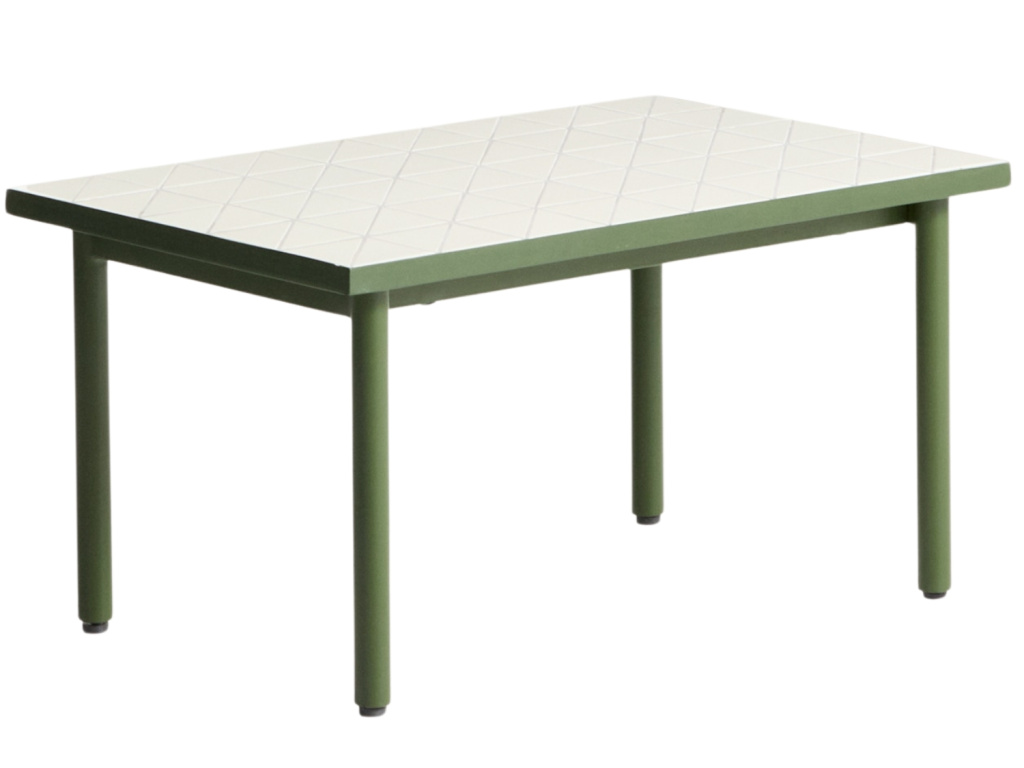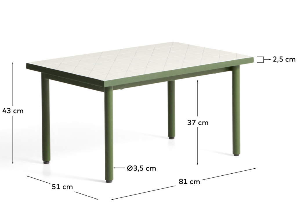 Zahradní odkládací stolek Maurina vnese do vašeho odpočinkového koutu sofistikovanou harmonii tradičního řemesla a moderního designu. Dominantním prvkem je jeho obdélníková deska s precizní bílou mozaikou, která skládá hold středomořské estetice v osvěžujícím geometrickém pojetí. Subtilní podnož z pozinkované oceli v elegantním zeleném laku zajišťuje vysokou stabilitu a odolnost vůči povětrnostním vlivům, zatímco plastové chrániče nohou citlivě pečují o povrch vaší terasy i interiéru.
