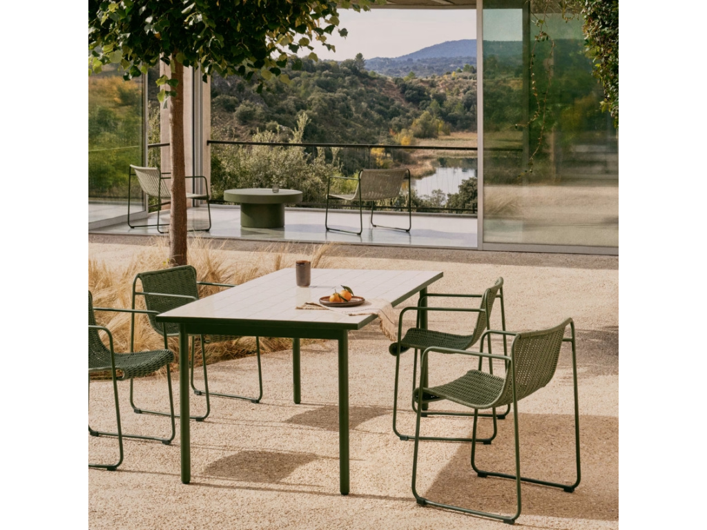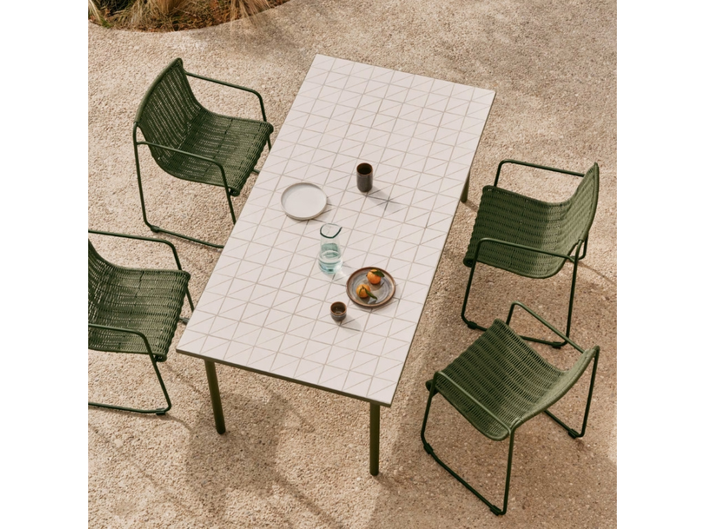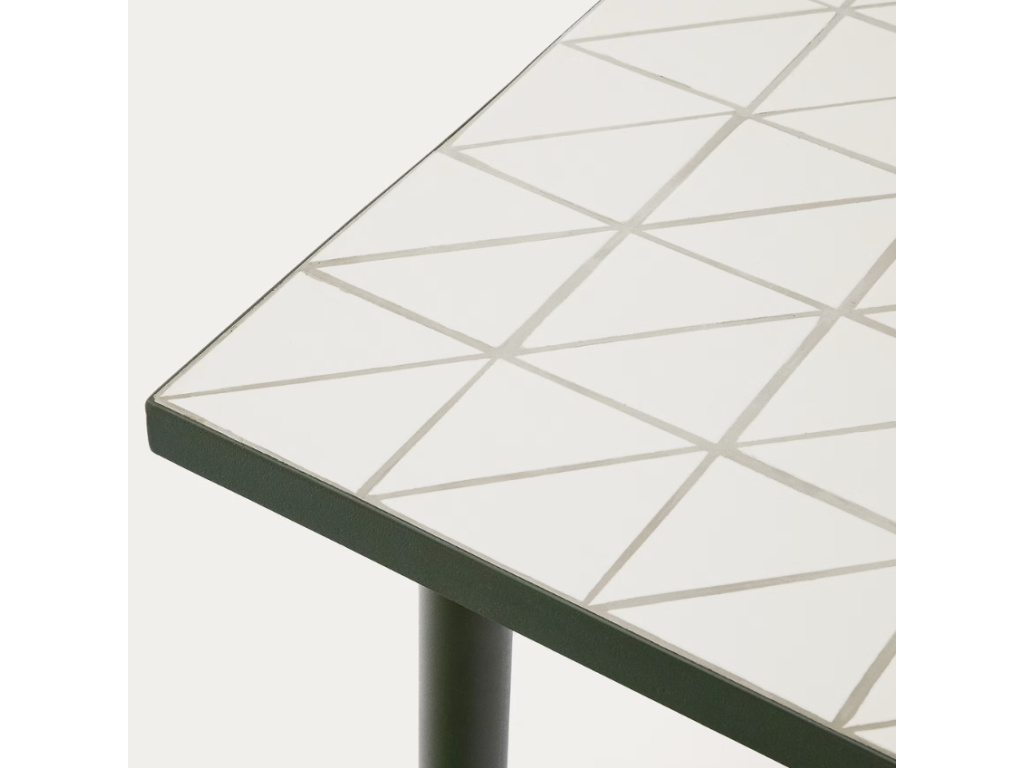 Zahradní stůl Maurina od značky Kave Home vnese na vaši terasu sofistikovanou harmonii tradičního řemesla a moderního designu. Hlavním prvkem je jeho mozaiková deska s geometrickým vzorem, která jakoby vzdávala hold středomořskému stylu. Naopak podnož z pozinkované oceli v elegantní zelené barvě je subtilní a jednoduchá, ale také stabilní a vysoce odolná vůči korozi a povětrnostním vlivům. Navíc díky plastovým chráničům chrání podlahu a umožňuje použití na terase, v zahradě i v interiéru. Stůl můžete dokonale sladit se zahradními židlemi ze stejnojmenné kolekce, ve které naleznete i další krásné designovky.