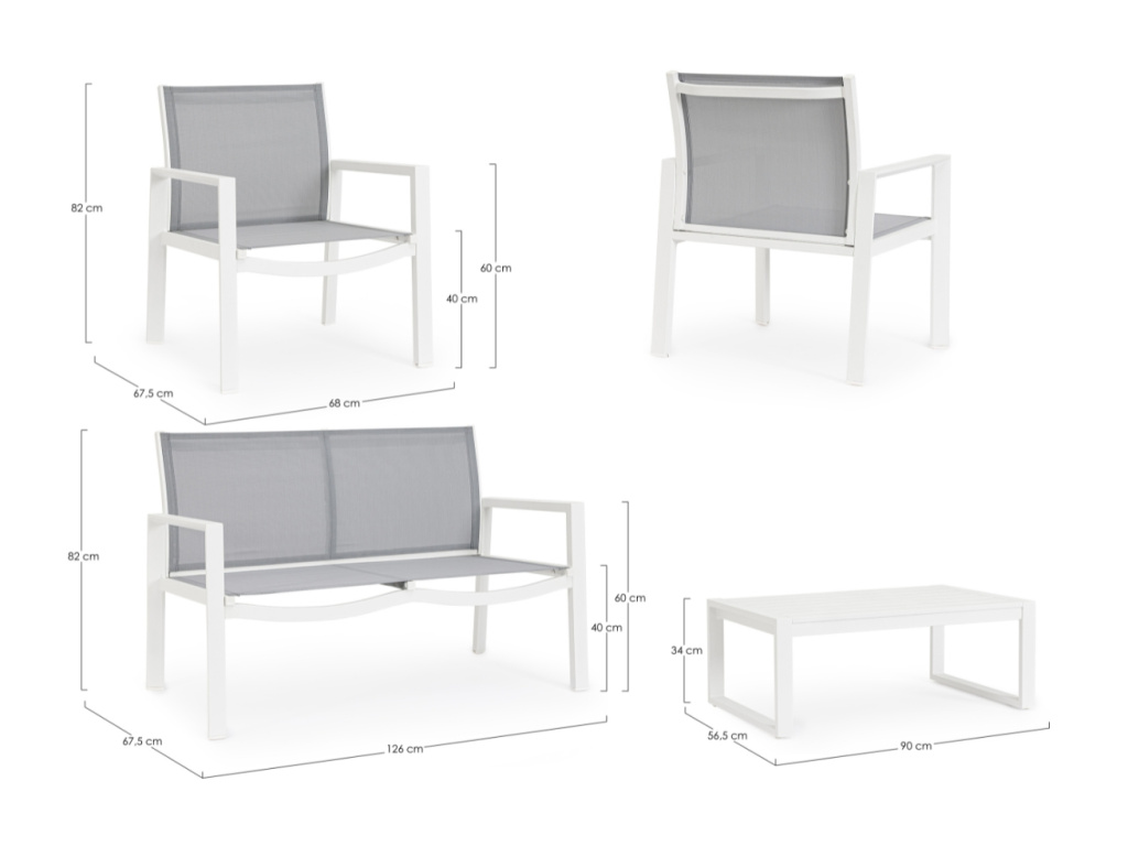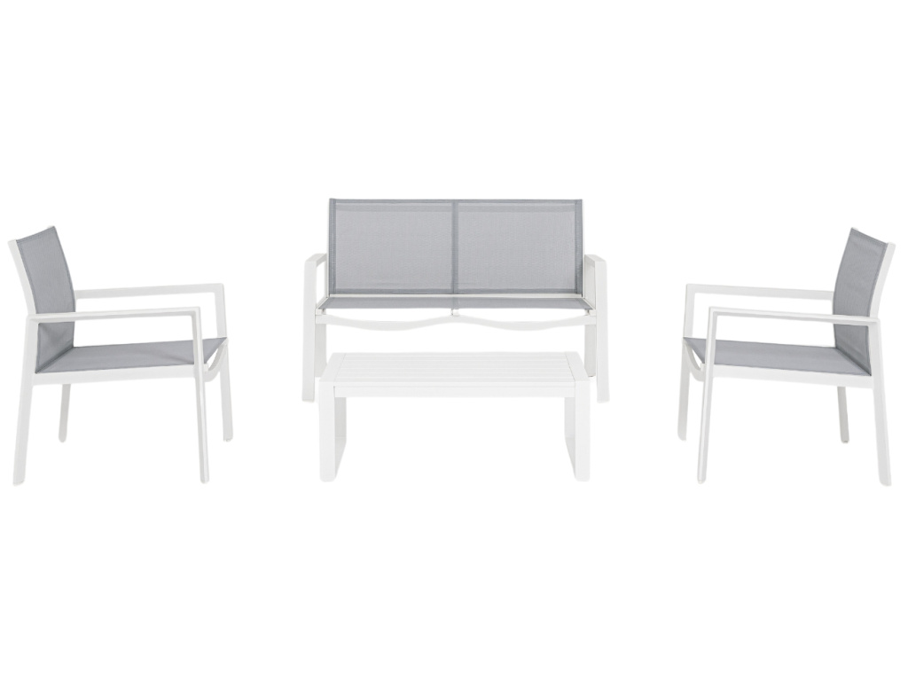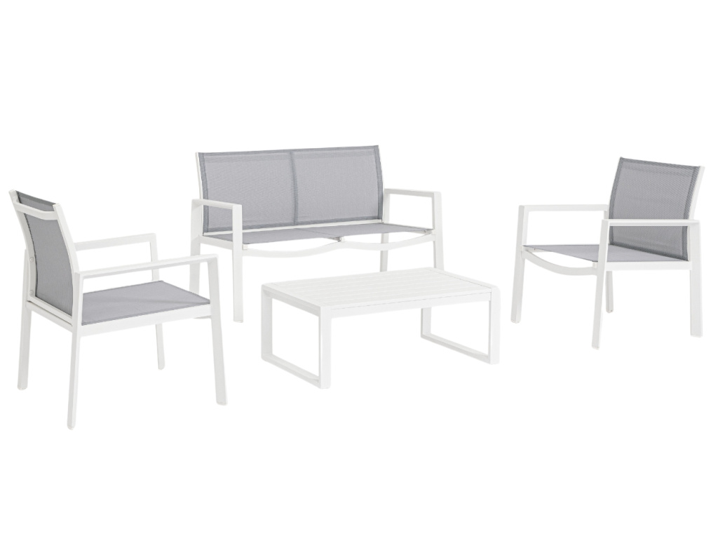 Vytvořte si na zahradě či terase místo pro klid a relaxaci se zahradním setem Kallen, který vám nabídne dvoumístnou pohovku, dvě křesla a odkládací stolek. Stylový set venkovního nábytku v minimalistickém stylu od italské značky Bizzotto vkusně kombinuje bíle lakovaný hliník a šedou síťovanou látku. Potěší vás jistě snadná údržba, která vám nezabere mnoho času. Užijte si krásné počasí na maximum, vaše příjemné posezení už na vás čeká.