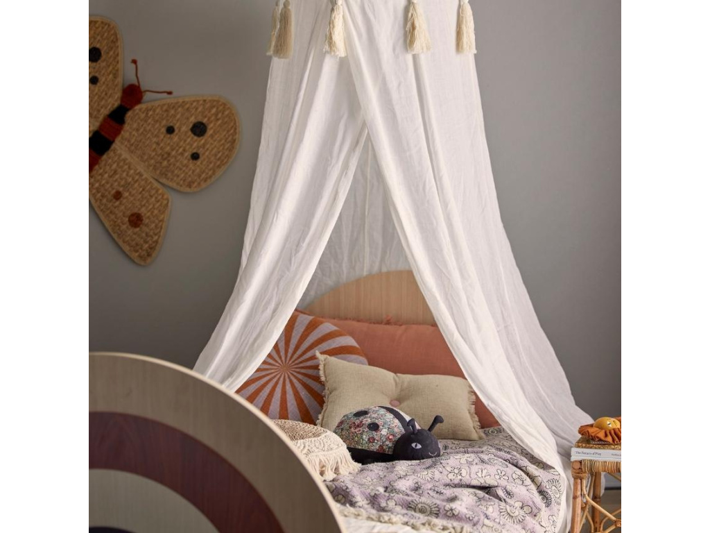 Kouzelný bílý baldachýn Bloomingville Canopy vytvoří nad postýlkou útulné místečko, kde se každé každé dítě bude cítit bezpečně a pohodlně. Bavlněný baldachýn můžete zavěsit i nad kolíbku nebo jen tak do prostoru a vytvořit tak schované místo na hraní i čtení knížek. Krásným jemným detailem jsou střapce zavěšené z vrchní obruče.