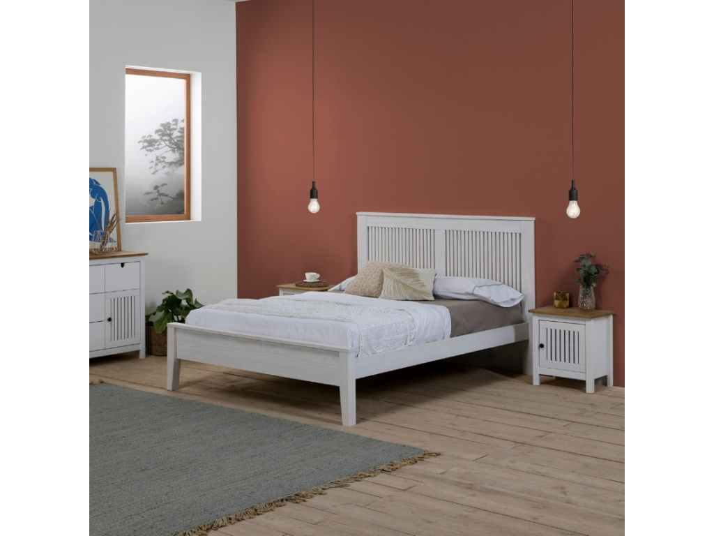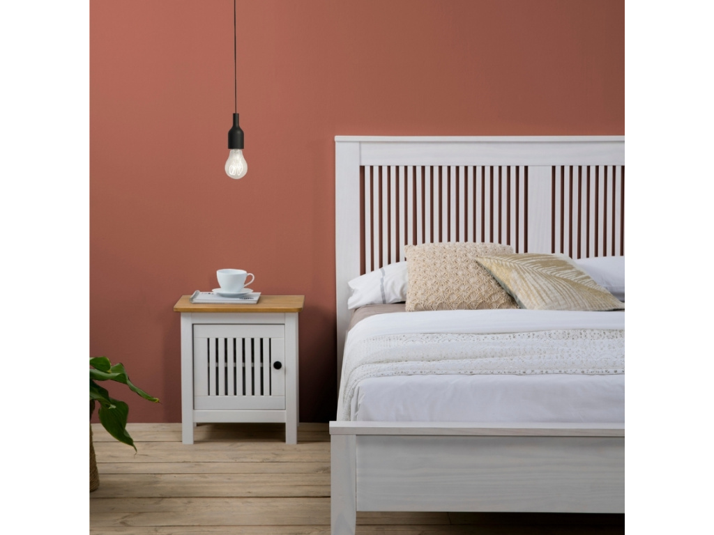 Noční stolek Bruna od značky Marckeric v bílé barvě vyrobený z masivního borovicového dřeva se stane praktickým a stylovým doplňkem vaší ložnice. Obdélníkový matně lakovaný korpus z masivního dřeva nabízí praktický úložný prostor s dvířky a s kovovými úchyty. Atraktivní kontrast dodává horní deska stolku, která je zanechaná v přírodním borovicovém odstínu. Doporučujeme tento noční stolek kombinovat také s ostatními produkty řady Bruna, získáte díky tomu dokonalou souhru nábytku ve vašem interiéru.