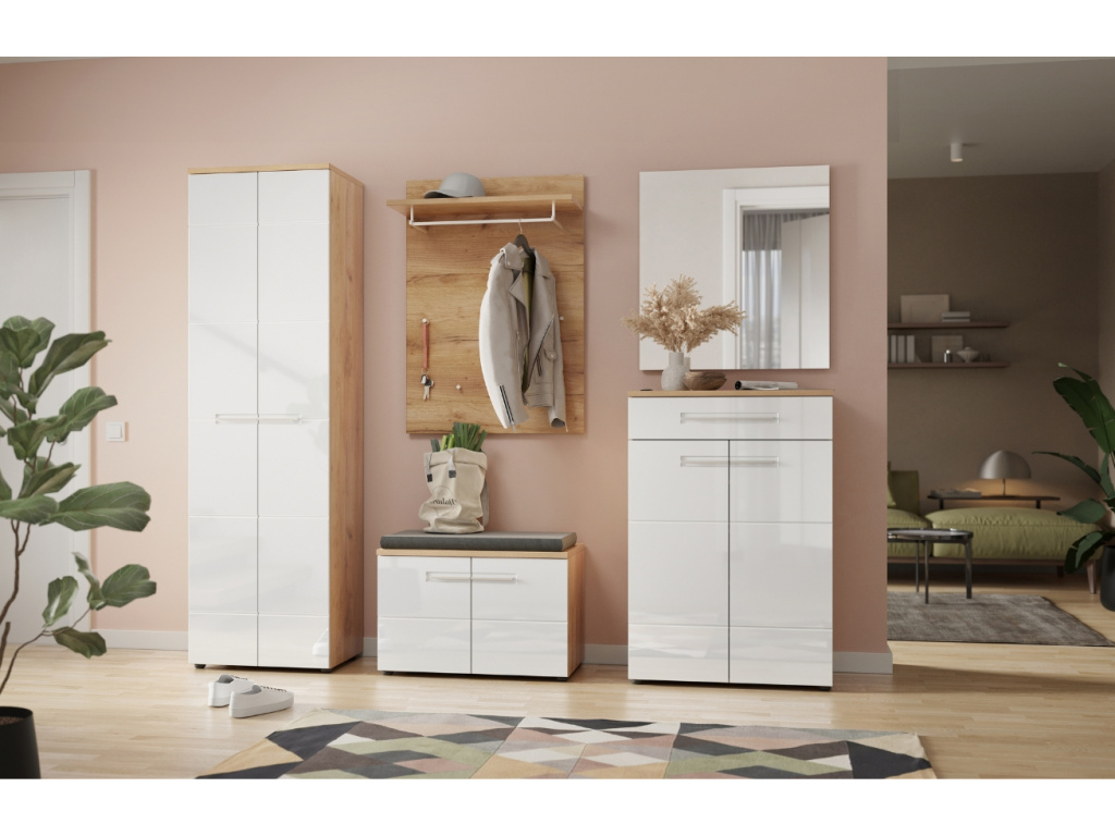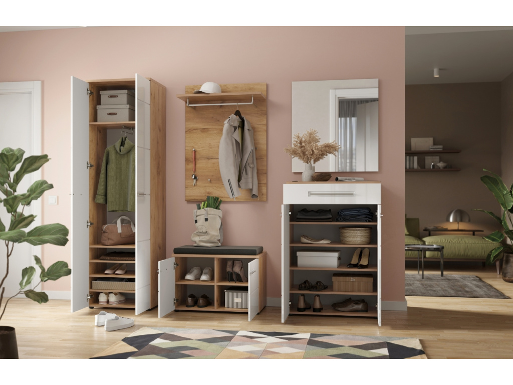 Designový botník Aledo vás zaujme svým moderním vzhledem. Vyrobený je z dřevotřísky v kombinaci s laminem a díky lesklé bílé barvě zpestří každý interiér. Na originalitě dodává botníku dubový dekor, který přinese do vaší předsíně útulnost a styl. Do botníku se pohodlně vejde až 8 párů bot. Výhodou botníku je, že se dvířka dovírají tiše a jemně díky integrovanému tlumiči. Doporučujeme botník kombinovat také s dalšími produkty ze stejnojmenné série.