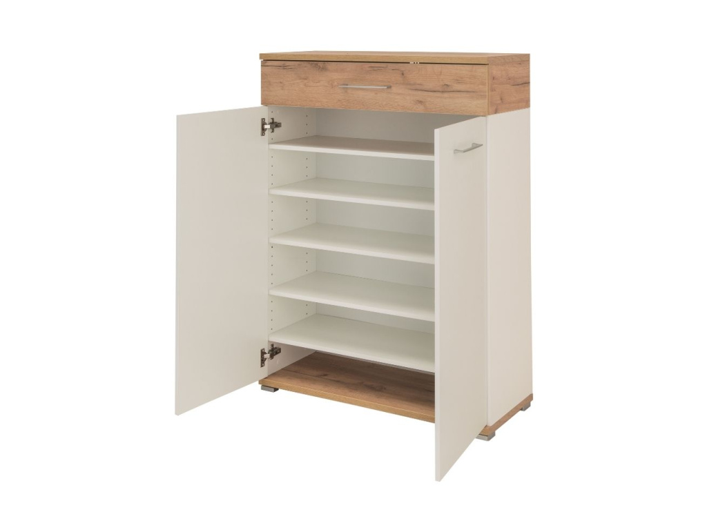 Luxusní botník Topix vám nabídne prostor až pro dvacet párů bot na pěti policích. Botník zaujme vkusným spojením dvou textur, v horní části je přírodní vzor dubu, který kontrastuje se zbylou částí botníku v bílé barvě. Praktickou výhodou jsou i kvalitní ABS hrany a tiché zavírání. Horní zásuvka vám poskytne dostatečný prostor pro vaše doplňky. Výšku vnitřních polic je možné nastavit dle potřeby. Botník je velmi odolný, materiál je vodovzdorný a voda z jeho povrchu steče.