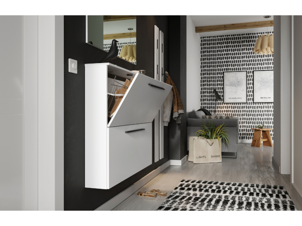 Designový botník Utah vás zaujme svým příjemným vzhledem. Je vyrobený z laminátu a na originalitě mu dodávají černé kovový úchytky, které v kombinaci s šedě lakovaným korpusem botníku vypadají skvěle. Botník Utah přinese do vaší předsíně pocit tepla a stane se nezbytnou součástí vašeho domova. Dvě výklopné zásuvky nabízejí prostor pro uložení až 8 párů bot. Botník je vhodný pro zavěšení a nebo ho můžete umístit přímo na zem.
