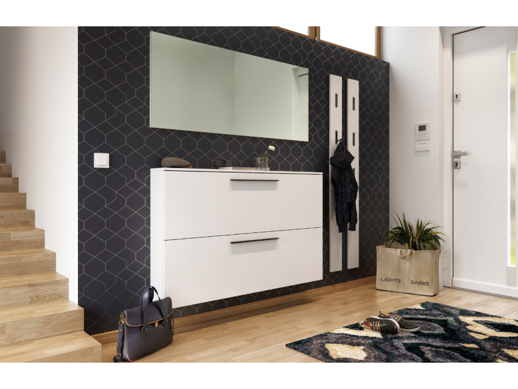 Designový botník Utah vás zaujme svým příjemným vzhledem. Je vyrobený z laminátu a na originalitě mu dodávají černé kovový úchytky, které v kombinaci s bílým lakovaným korpusem botníku vypadají skvěle. Botník Utah přinese do vaší předsíně pocit tepla a stane se nezbytnou součástí vašeho domova. Dvě výklopné zásuvky nabízejí prostor pro uložení až 12 párů bot. Botník je vhodný pro zavěšení a nebo ho můžete umístit přímo na zem.