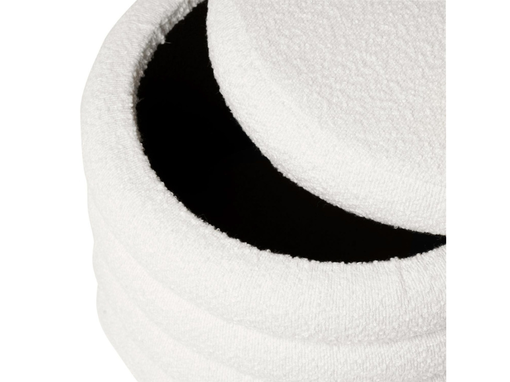 Taburet Harry v sobě spojuje hravý design a praktické využití, díky čemuž se stane stylovým i funkčním doplňkem každého moderního interiéru. Bílá bouclé látka se postará o estetický dojem, zatímco skrytý úložný prostor umožní snadno uschovat drobnosti, které chcete mít po ruce, ale ne na očích. Taburet skvěle zapadne do obývacího pokoje vedle pohovky, ložnice nebo dětského pokoje, kde poslouží k sezení i úschově hraček.