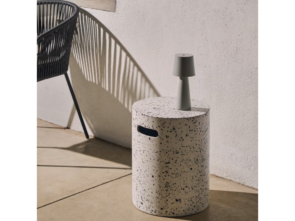 Atypický odkládací stolek Kave Home Jenell vás zaujme svým neobvyklým materiálem i tvarem. Stolek je celý vyroben z materiálu zvaný terrazzo, což je směs cementové malty, barviv a ušlechtilých kamenných drtí díky čemuž získává odolnost a specifický vzhled. Praktické otvory po stranách stolku vám usnadní manipulaci se stolkem. Díky použitým materiálům lze stolek využít jak v exteriéru, tak interiéru.