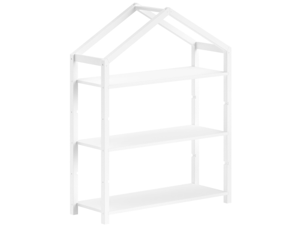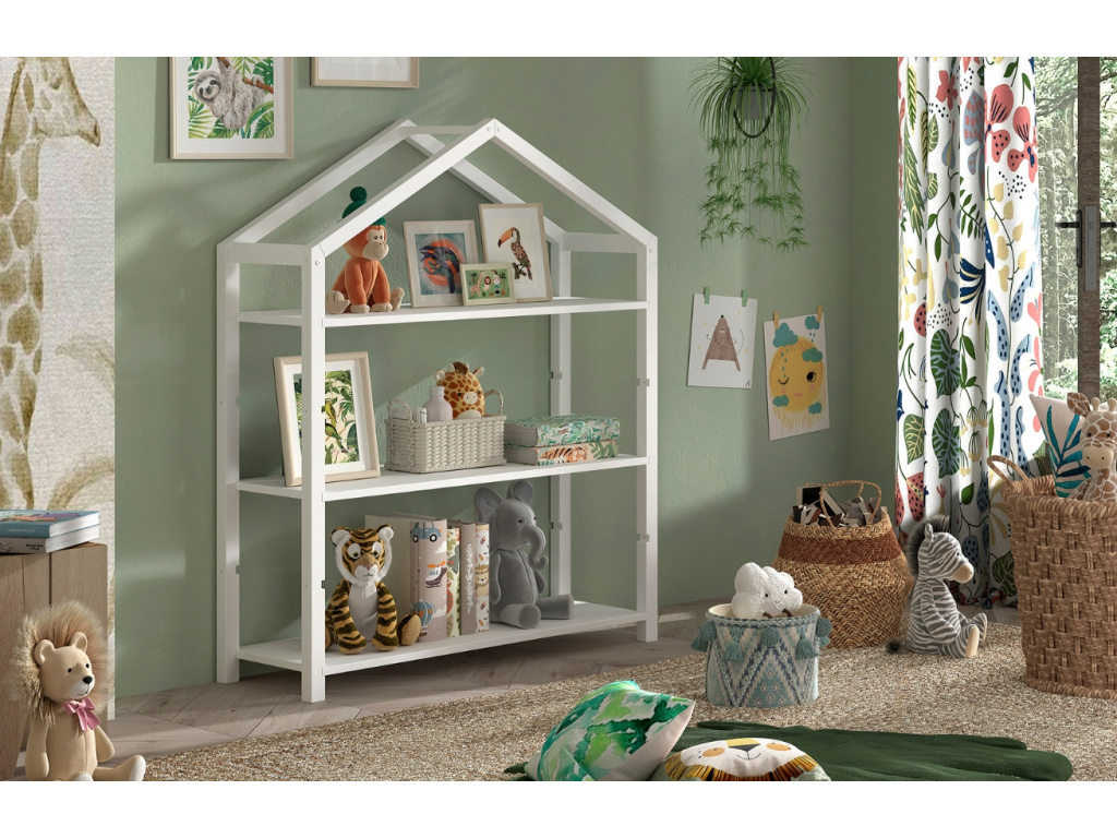 Dřevěný regál Forrest v bílé lakované úpravě je ideální pro vystavení knížek, hraček i dekorací v dětském pokoji. Díky originálnímu tvaru domečku vnese do místnosti hravost a podpoří kreativní náladu, a jeho čistý, minimalistický vzhled se snadno kombinuje s ostatními doplňky i nábytkem. Regál je dostupný ve třech barevných variantách.