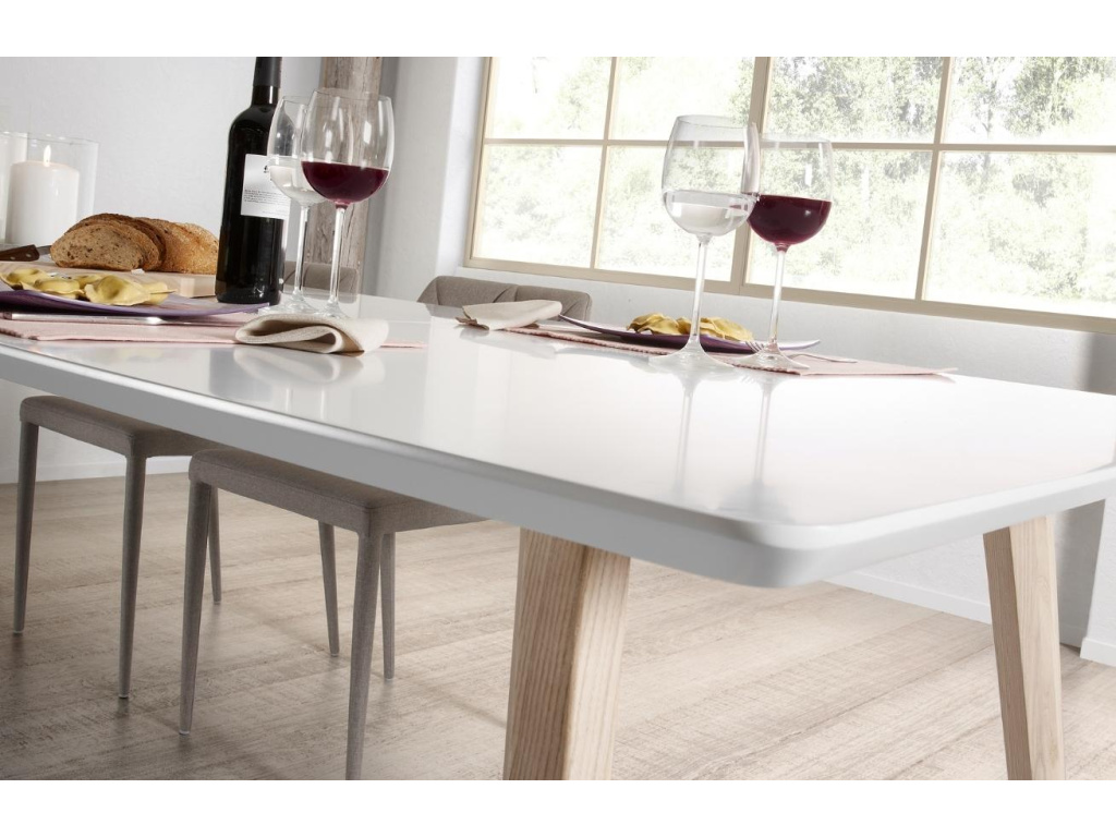 Dřevěný rozkládací jídelní stůl Eunice zaujme svým poutavým vzhledem, který je designován do skandinávského stylu. Bíle lakovaná sololitová deska vytváří společně s masivní jasanovou podnoží atraktivní kontrast. Stůl je možné rozložit na 3 různé velikosti pomocí dvou přídavných desek.
