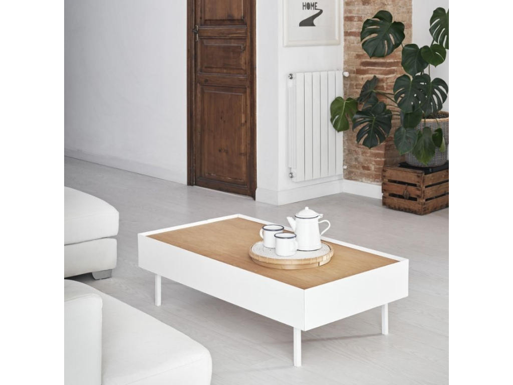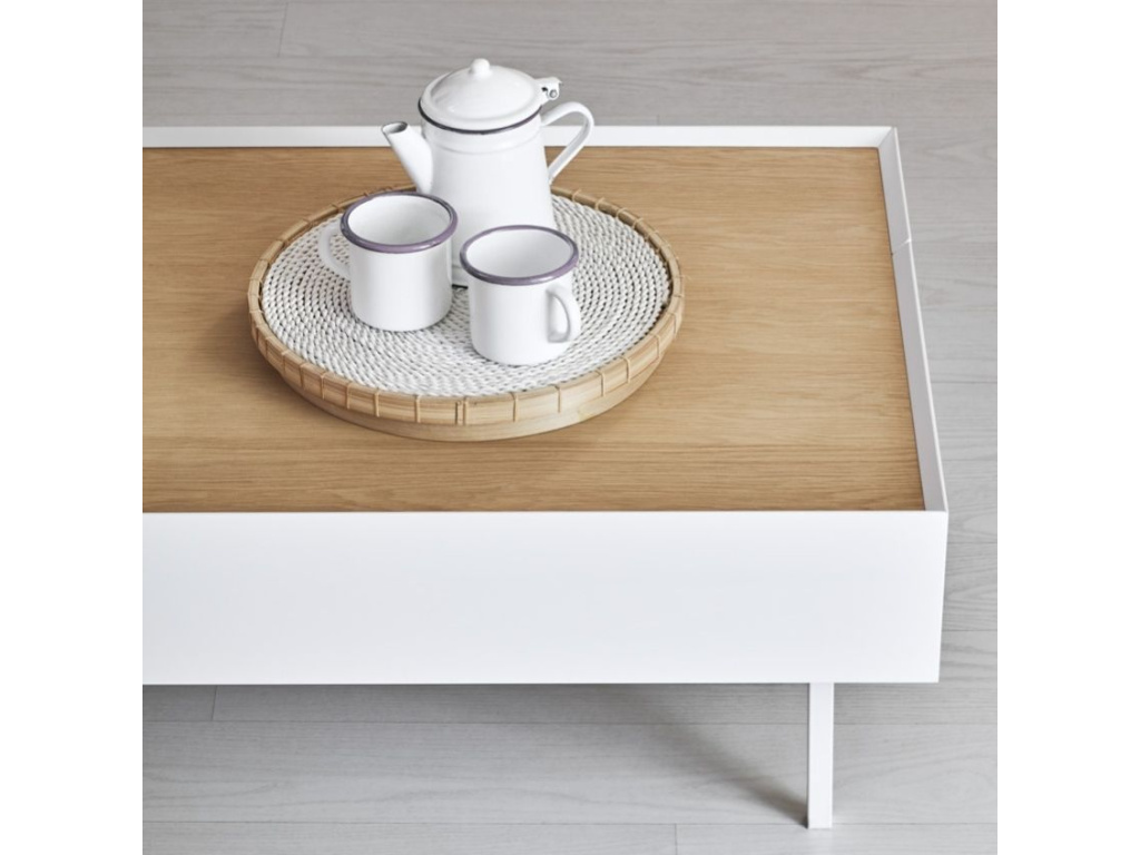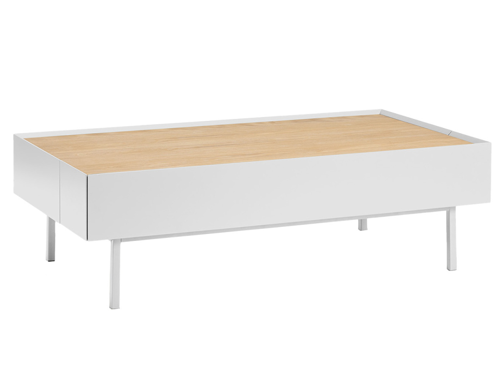 Konferenční stolek Teulat Arista bude stylovou ozdobou každého obývacího pokoje. Dominantní bílá barva podtrhuje minimalistický design stolku, se kterým kontrastuje vrchní deska s dubovou dýhou v přírodním odstínu. U stolku vás potěší i úložný prostor v podobě výsuvných zásuvek, což vám bude ulehčovat organizaci a úklid vašeho inventáře. Moderní styl stolku podtrhuje tenká lakovaná kovová podnož, která barevně ladí se zbytkem stolku.