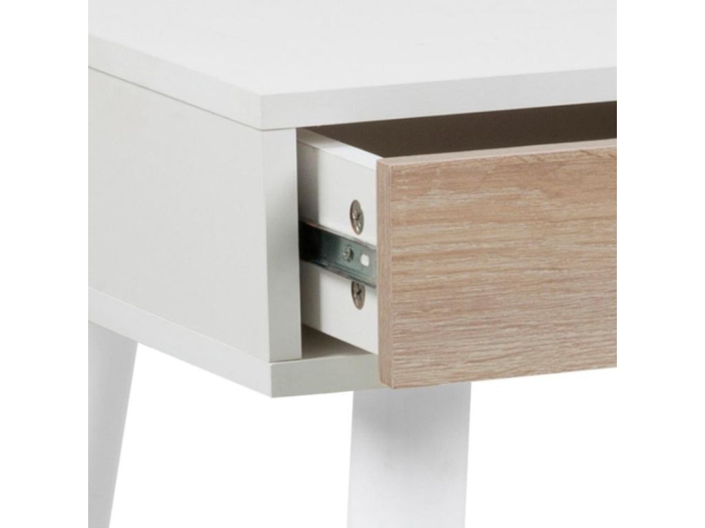 Pracovní stůl Pluto je nábytkem s výraznými prvky retro stylu, avšak v kombinaci s praktickými moderními materiály. Stůl poskytuje úložný prostor ve třech zásuvkách, jejichž čela jsou z laminátu v dubovém dekoru, avšak korpus pro tyto zásuvky včetně stolové desky je z laminátu v bílém dekoru. Laminát je velmi odolný moderní materiál, který nevyžaduje žádnou speciální údržbu.