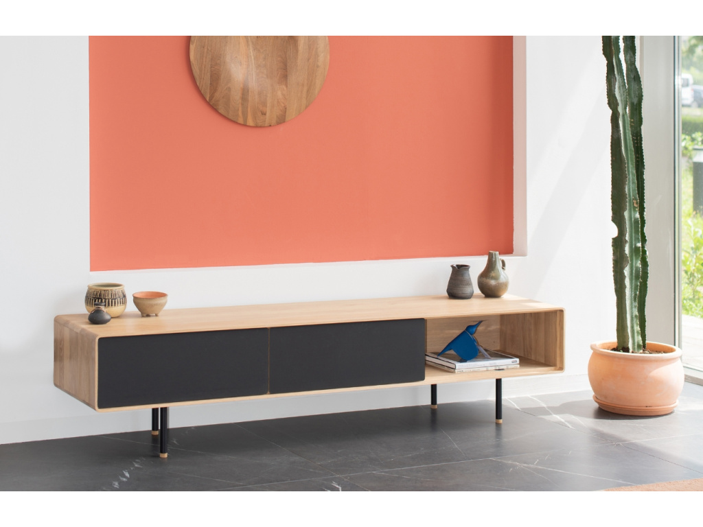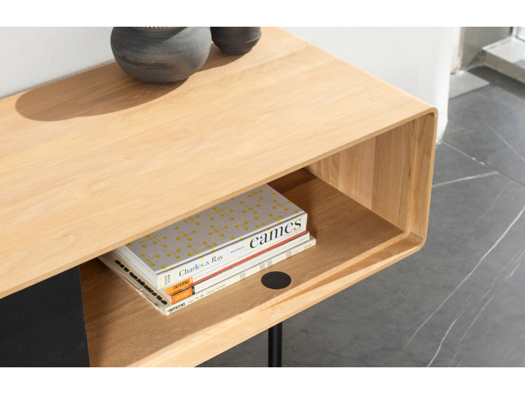 TV stolek Fina od značky Gazzda bude ve vašem obývacím pokoji nebo ložnici vypadat perfektně. Jeho konstrukce je vyrobena z masivního naolejovaného dubového dřeva, kterou doplňují bílé zásuvky z MDF. Minimalistická ocelová podnož působí vzdušným dojmem a celkově mu dodává na eleganci. Stolek nabízí dostatek úložného prostoru – disponuje dvěma prostornými zásuvkami a otevřenou policí, kam lze umístit dekorace, knihy nebo DVD přehrávač.Udělejte svůj interiér útulnější s TV stolkem Fina – nabízíme ho i v další barvě a velikosti!