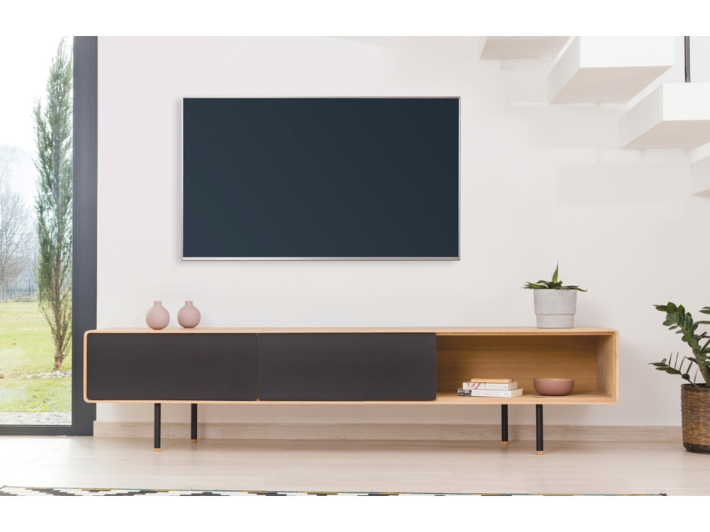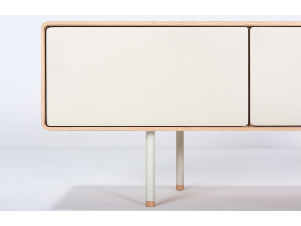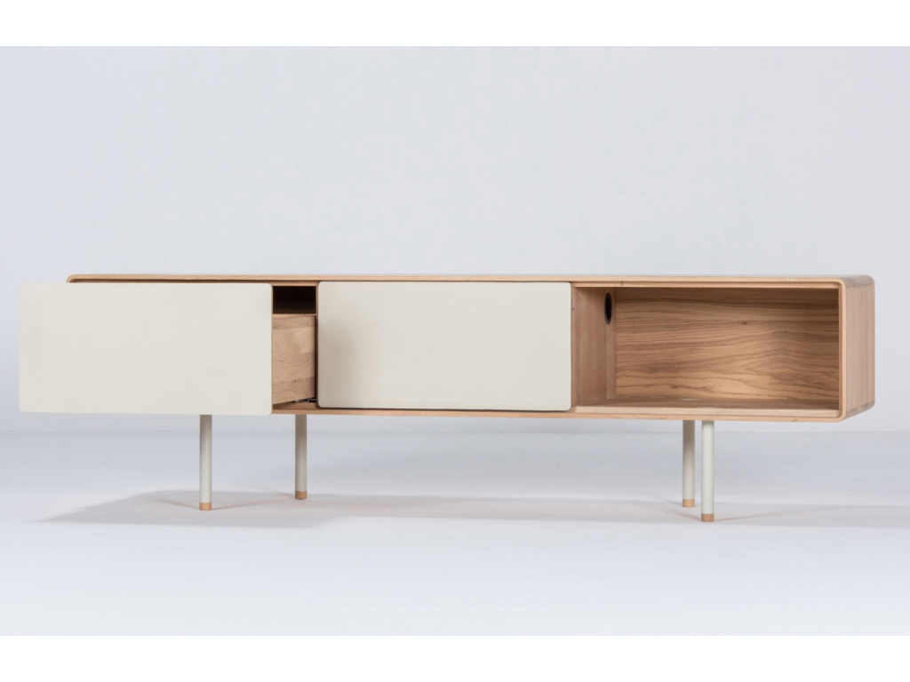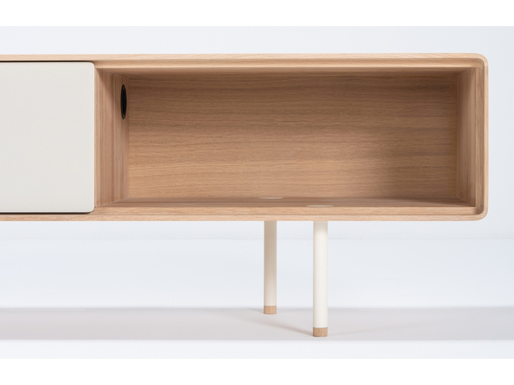 TV stolek Fina od značky Gazzda bude ve vašem obývacím pokoji nebo ložnici vypadat perfektně. Jeho konstrukce je vyrobena z masivního naolejovaného dubového dřeva, kterou doplňují bílé zásuvky z MDF. Minimalistická ocelová podnož působí vzdušným dojmem a celkově mu dodává na eleganci. Stolek nabízí dostatek úložného prostoru – disponuje dvěma prostornými zásuvkami a otevřenou policí, kam lze umístit dekorace, knihy nebo DVD přehrávač. Udělejte svůj interiér útulnější s TV stolkem Fina – nabízíme ho i v další barvě a velikosti!