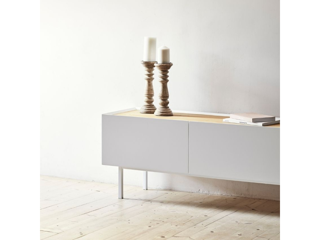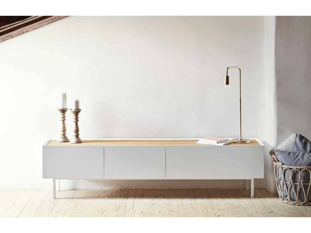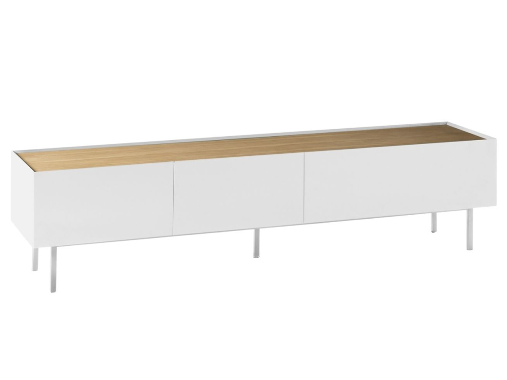 TV stolek Teulat Arista bude stylovou ozdobou každého moderního interiéru a obývacího pokoje. Dominantní bílá barva podtrhuje minimalistický design stolku, se kterým kontrastuje vrchní deska s dubovou dýhou v přírodním odstínu. Úložný prostor je prakticky rozčleněn do jedné vysouvací zásuvky a dvou s výklopnými dvířky, což vám bude ulehčovat organizaci vašeho inventáře. Moderní styl komody podtrhuje tenká lakovaná kovová podnož, která barevně ladí se zbytkem stolku.