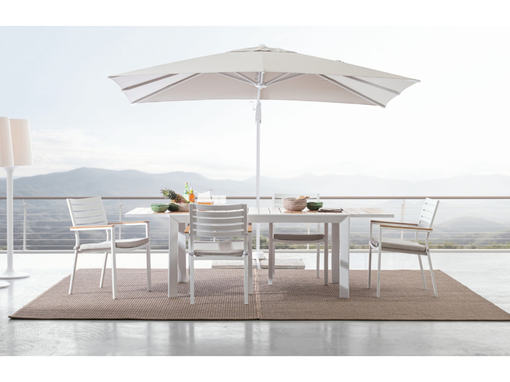 Prostorný hliníkový rozkládací jídelní stůl Belmar od italské značky Bizzotto si oblíbí všichni, kteří milují přírodní vzhled dřeva, ale už tolik nestojí o náročnou údržbu. Deska stolu se skládá ze stylových lamel s tzv. efektem dřeva, které vizuálně napodobují vzhled a texturu masivu. Díky hliníkové konstrukci ošetřené speciálním práškovým nátěrem je stůl pevný, stabilní a připravený odolat i venkovním vlivům. Potěší vás jistě také nastavitelné nohy, se kterými snadno ustavíte stůl i na nerovném povrchu. Při početnějších návštěvách jistě oceníte také možnost jídelní stůl jednoduše rozložit a pohostit až 10 osob. Vybírejte ze dvou atraktivních barev a dvou praktických rozměrů.