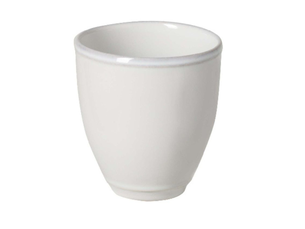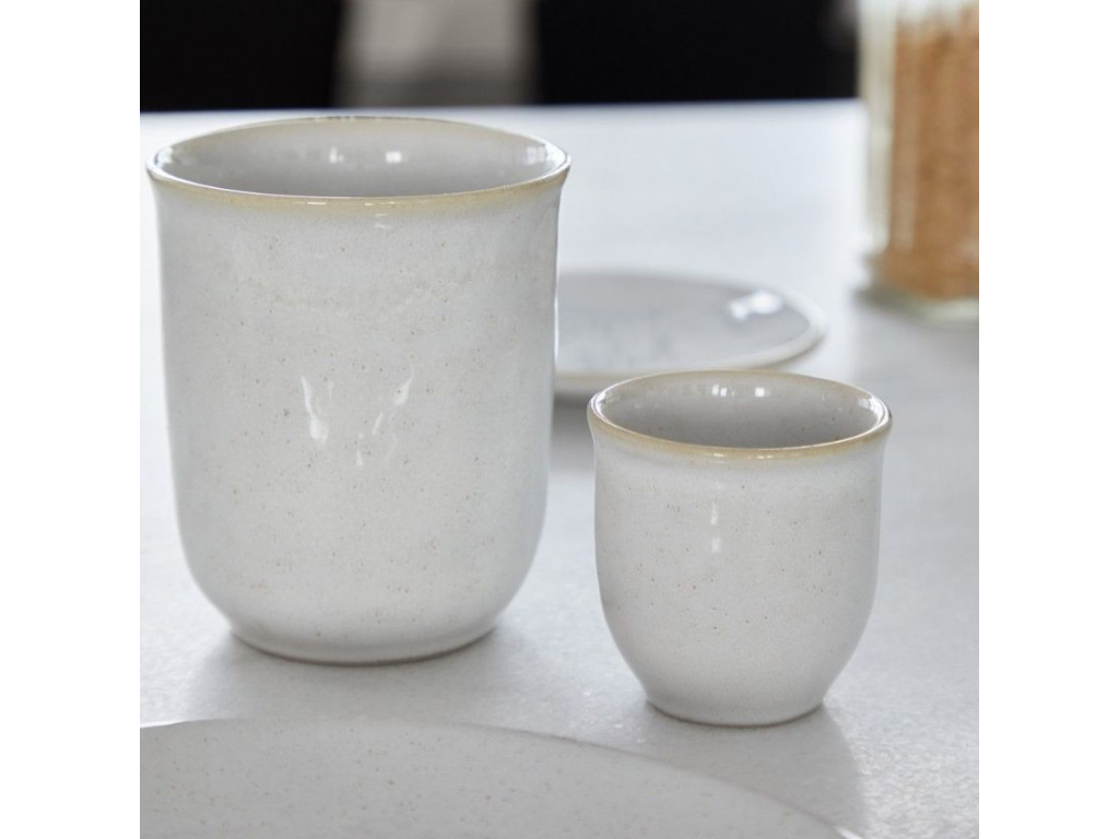 Bílý kameninový hrneček, který je svou malou velikostí ideálem pro rychlé ranní espresso. Kalíšek lze také využít při pohoštění jako nádobku na dip.