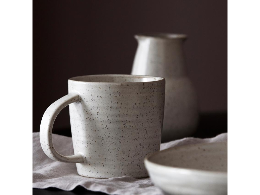 Hrnek Pion zaujme na první pohled svým čistým designem. Je vyroben z kameniny a glazován matnou bílou glazurou s jemnými skvrnkami. Právě díky neutrální barvě se bude hodit ke každé současné jídelní soupravě a dalším keramickým předmětům. Můžete ho také zkombinovat s nádobím ze stejné řady Pion a doladit tak stolování vašeho jídelního stolu k úplné dokonalosti!