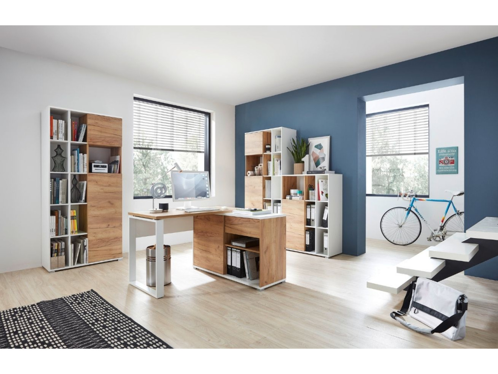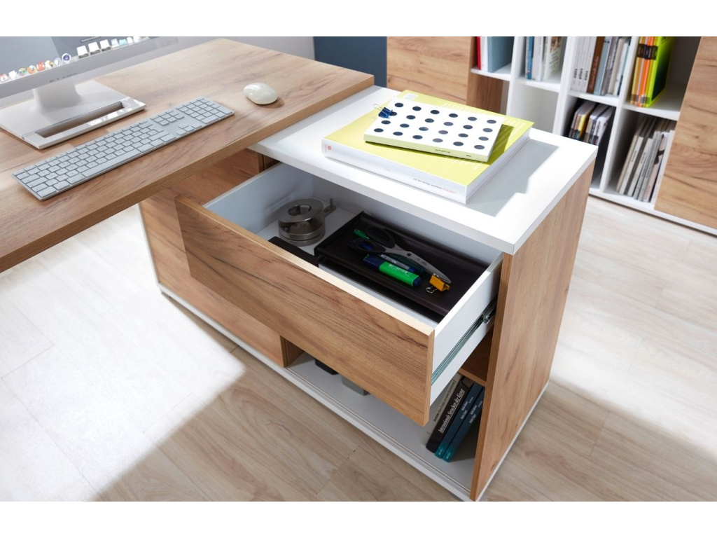Moderní kancelářský stůl Lioni od značky GERMANIA je inspirovaný severským stylem. Kombinace bílé a přírodní barvy laminátového korpusu a desky vytváří jemný a čistý vzhled, který do vašeho interiéru vnese nádech minimalistického designu. Prostorné úložiště zajišťuje komoda s 2 otevřenými přihrádkami, 1 zásuvka a 2 uzavřené police za dvířky, díky čemuž pohodlně uložíte velké množství všeho inventáře. Posuvná dvířka poskytují ochranu soukromí pro důvěrné dokumenty, zatímco otevřené police poskytují rychlý přístup k často používaným předmětům. Povrchová úprava celého stolu z melaminové pryskyřice poskytuje nárazuvzdorný a vlhkosti odolný povrch. Díky nárazuvzdorným ABS hranám máte vyšší jistotu odolnosti. Doporučujeme kombinace všech produktů z řady Lioni.