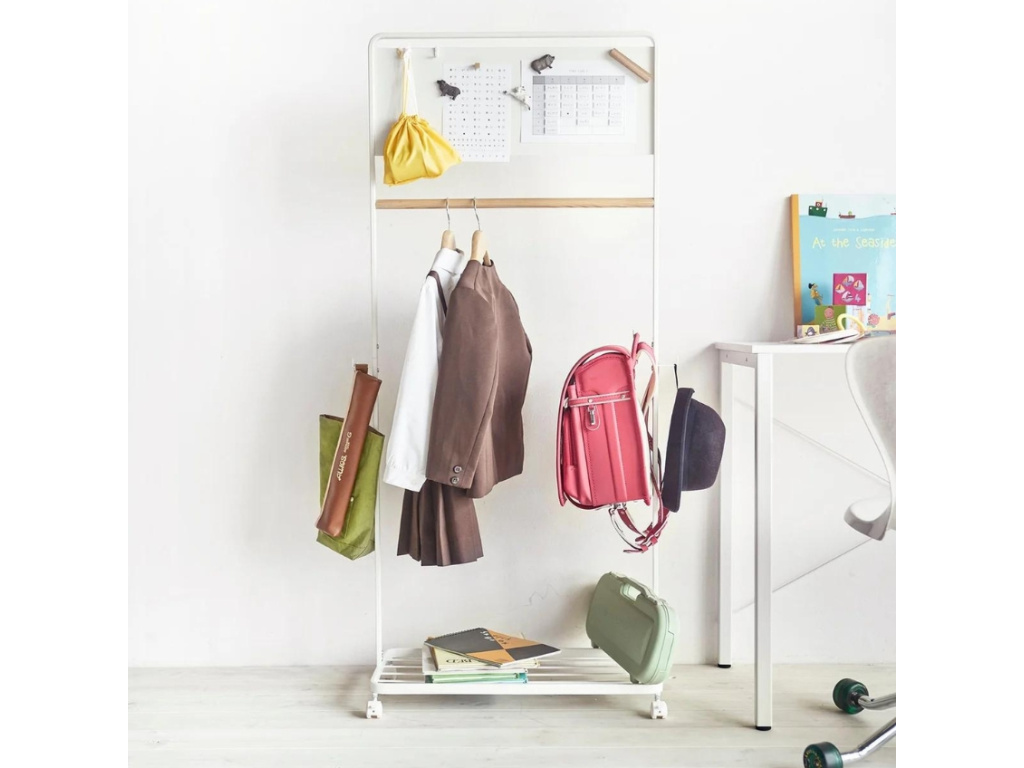 Pojízdný dětský věšák Tower od značky Yamazaki je vyroben z bíle lakovaného kovu a bude elegantním doplňkem nejen do dětského pokoje. Tower nabízí šatní tyč z bukového dřeva na pověšení ramínek. Také disponuje dolní policí na uložení tašek nebo bot. Součástí věšáku je i magnetická nástěnka či háčky k pověšení batohů a tašek. Výhodou věšáku Tower jsou kolečka, která zajišťují snadnou manipulaci po prostoru.