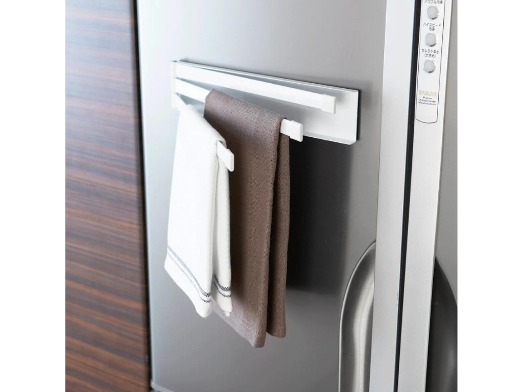 Magnetický držák na utěrky Tower od značky Yamazaki je elegantní a praktický doplněk do každé kuchyně. Držák je vyrobený z bíle lakovaného kovu a disponuje třemi výklopnými rameny, která umožňují snadné zavěšení více utěrek najednou. Jeho magnetický design umožňuje snadné a flexibilní umístění na jakýkoli kovový povrch, jako jsou lednice nebo kovová dvířka. Tower může být použit i v koupelně na ručníky nebo v dílně na zavěšení různých hadříků a textilií.