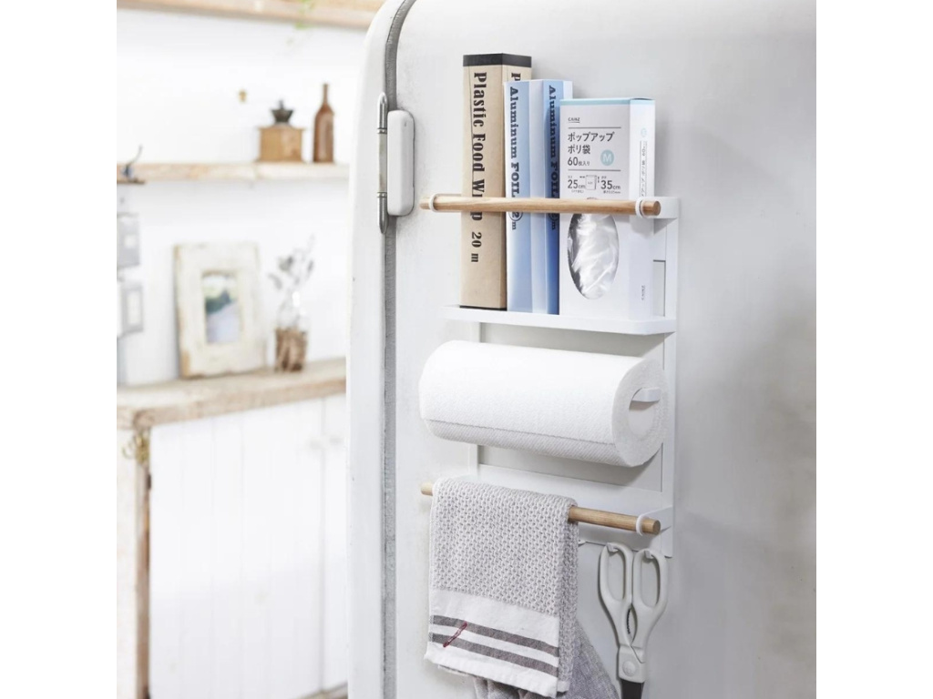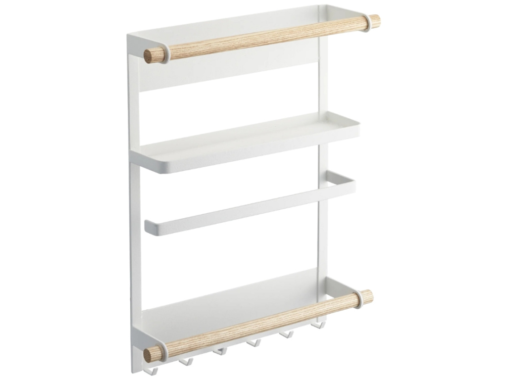 Multifunkční kuchyňský organizér Tosca od značky Yamazaki je praktický a stylový doplněk, který pomáhá udržet kuchyňské nástroje a potřeby přehledně uspořádané a snadno dostupné. Tosca je vyroben z kvalitního lakovaného kovu a dřeva, což zajišťuje jeho odolnost a dlouhou životnost. Organizér je ideální pro zavěšení vařeček, špachtlí, nebo jiných kuchyňských potřeb nebo pro uložení kořenek a dalších malých kuchyňských potřeb. Také umožňuje snadný přístup k papírovým či textilním utěrkám, kdykoliv je potřebujete. Velký plošný magnet umožňuje snadné a bezpečné připevnění organizéru na jakýkoliv kovový povrch, jako je lednička nebo kovová kuchyňská deska.