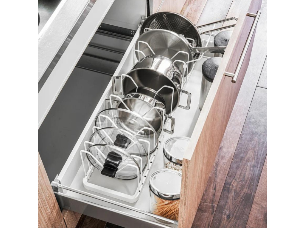Organizace kuchyňského prostoru může být výzvou, zejména pokud máte omezený prostor a mnoho různých nádobí, jako jsou pokličky, pánve a pečicí formy. Organizér Tower od značky Yamazaki představuje elegantní a praktické řešení pro tyto potřeby. Tower je vyroben z bíle lakovaného kovu a ABS plastu, což zajišťuje jeho dlouhou životnost a odolnost proti opotřebení. Tower lze přizpůsobit délce od 45 cm do 82 cm, což umožňuje jeho umístění do různě velkých skříněk a polic. Přepážky je možné nastavit podle velikosti a tvaru vašeho nádobí. Tímto způsobem můžete ukládat různé druhy pokliček, pánví a pečicích forem bez obav, že se poškrábou nebo poškodí. Jeho flexibilní design a vysoce kvalitní materiál zaručují dlouhou životnost a spolehlivost.