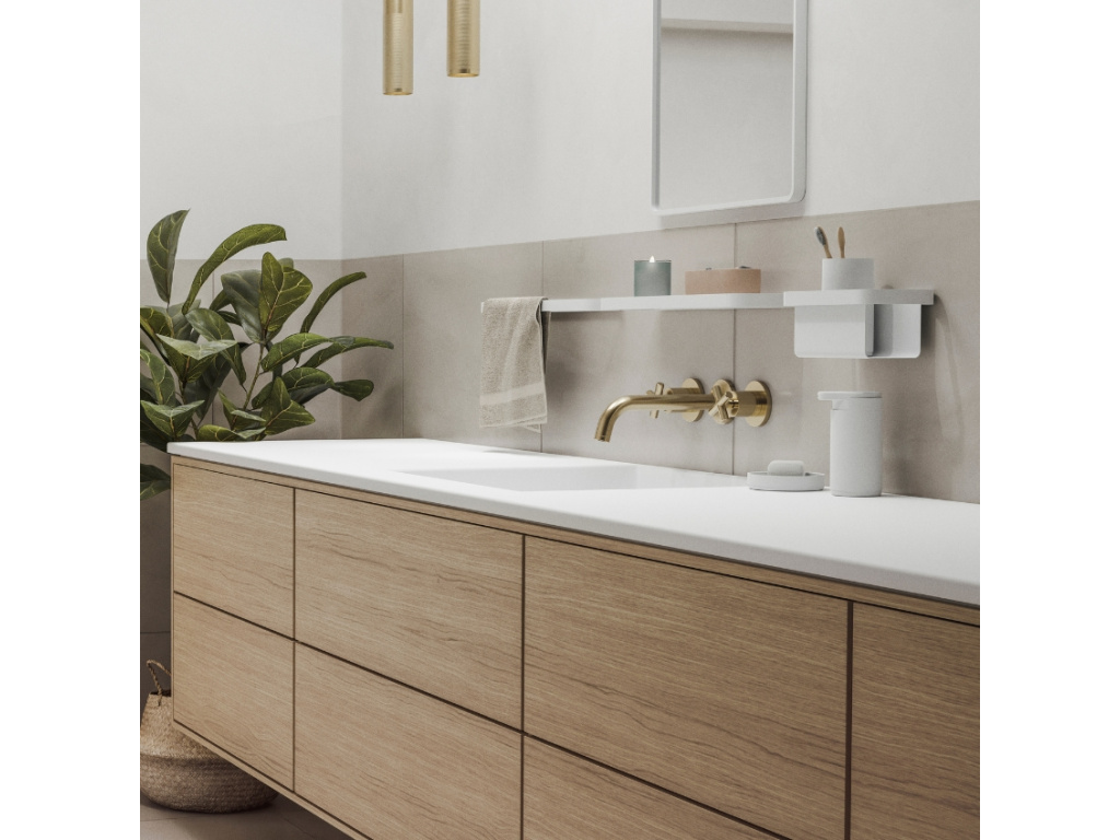 Nástěnný držák pochází z kolekce Rim značky Zone Denmark, která nabízí široký výběr koupelnových doplňků s moderní dánskou estetikou. Díky důmyslně skrytým úchytkám vytvoří v koupelně dojem čistého, plovoucího designu, který dokonale zapadne do interiérů s důrazem na minimalismus a funkčnost. Perfektně se hodí do sprchového koutu k organizaci sprchového gelu, šamponu či kondicionéru, nebo ho lze připevnit u umyvadla a využít pro uspořádání zubních kartáčků, hřebenu či jiných drobností. Vyrábí se z odolného práškově lakovaného hliníku a díky nadčasovému a univerzálnímu vzhledu jej snadno zkombinujete s ostatním vybavením.
