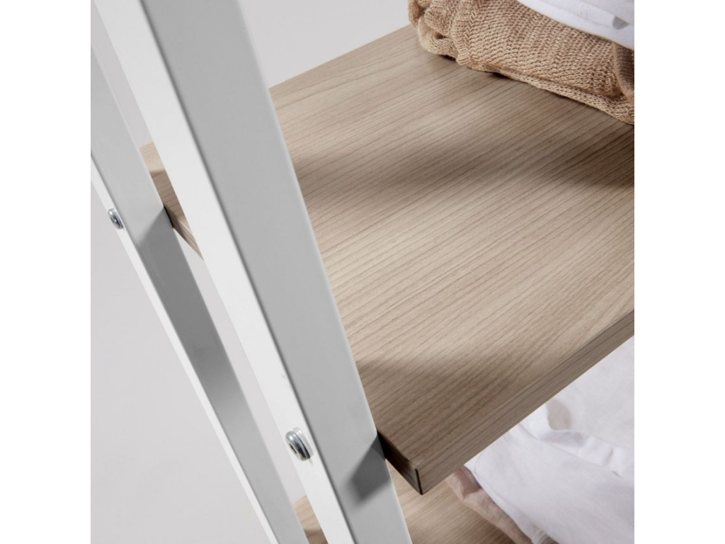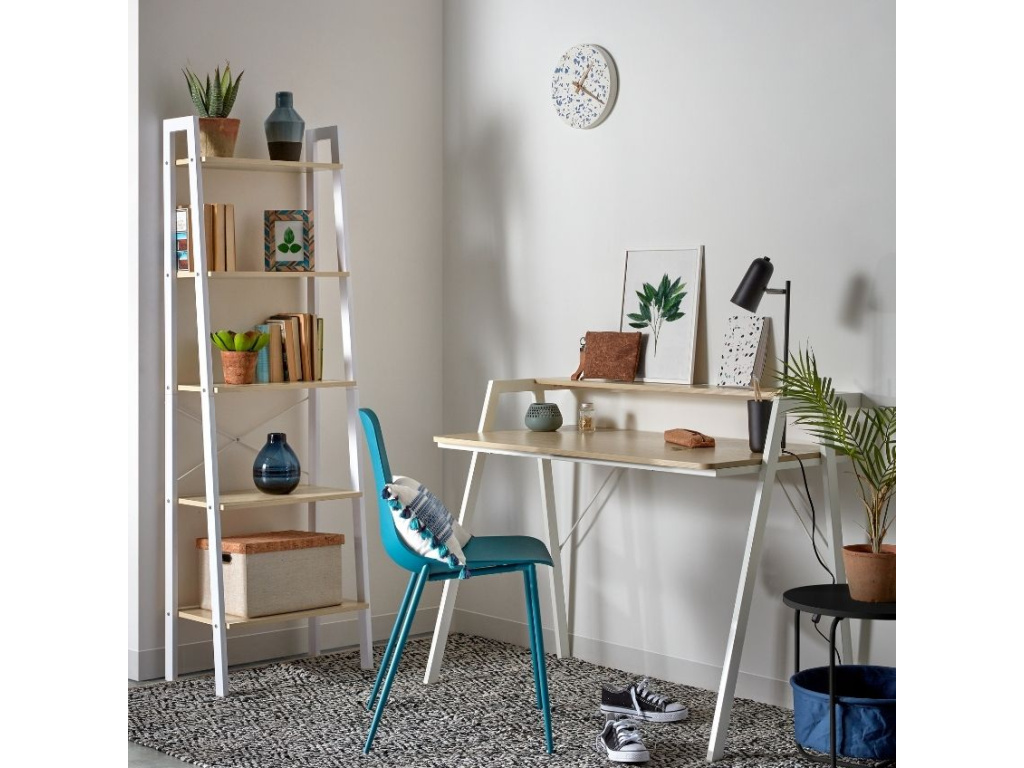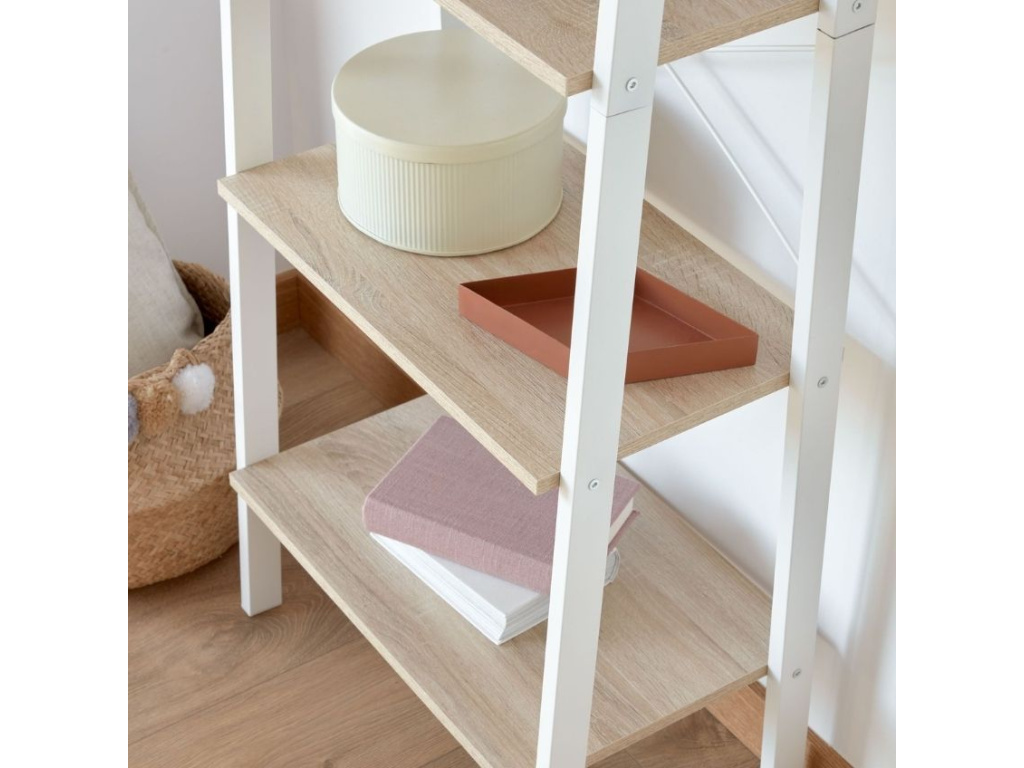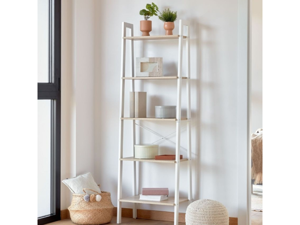 Moderní regál Kave Home Aarhus připomíná svým tvarem žebřík. Disponuje pěti policemi s různou hloubkou, které se díky tomu skvěle hodí k vystavení dekorací nebo umístění květin. Na jeho výrobu byl použit bíle lakovaný kov a jeho police tvoří melamin s povrchovou úpravou s dřevěným efektem. Regál se skvěle hodí do obývacího pokoje i jídelny, využití ale najde také v pracovně nebo kanceláři.