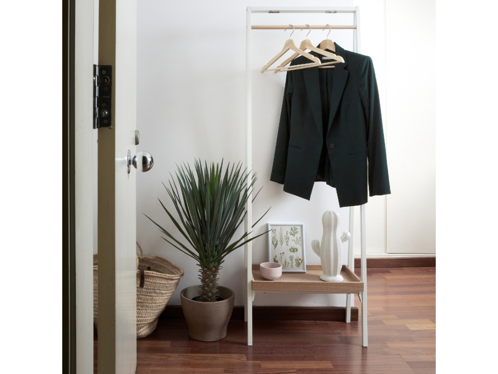 Podívám seBílý kovový stojací věšák Kave Home Benny 160 cm s dubovou poličkou