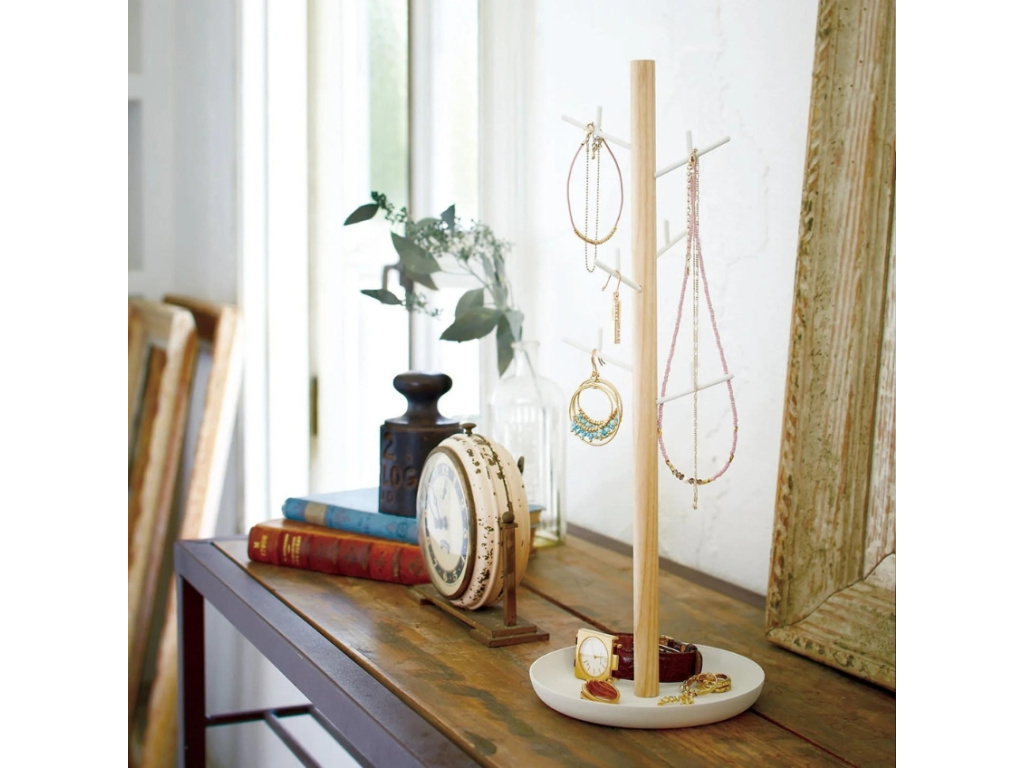 Tosca je unikátní stojan na šperky od značky Yamazaki, který na první pohled zkrátka zaujme! Stojánek je vybaven několika větvičkami, které slouží k zavěšení náhrdelníků, náramků a dalších šperků. Na základně stojánku se nachází praktická odkladná miska, která je ideální pro uložení menších předmětů, jako jsou prsteny, náušnice nebo brože. Jeho kompaktní velikost umožňuje umístění na toaletní stolek, komodu nebo poličku. Díky svému minimalistickému designu a kombinaci bílé barvy s bukovým dřevem se Tosca stane stylovým doplňkem každého interiéru.