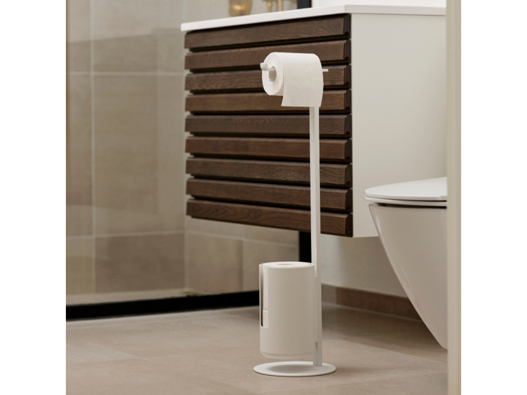 Stojan na toaletní papír Rim je navržen v duchu jednoduchosti a moderní dánské estetiky. Spodní zásobník pojme 2 role toaletního papíru a zajistí, že budou vždy přehledně uskladněny a snadno dostupné. Konstrukce je vyrobena z práškově lakovaného hliníku, takže je stojan odolný a stabilní. Celou místnost můžete sladit s ostatními produkty z široké nabídky kolekce Rim, která získala prestižní ocenění German Design Award Winner 2022 za vynikající design. Závěsný dávkovač mýdla, stojan na zubní kartáčky, držák na ručníky, pedálový koš... tato kolekce nabízí vše, co vás jen napadne!