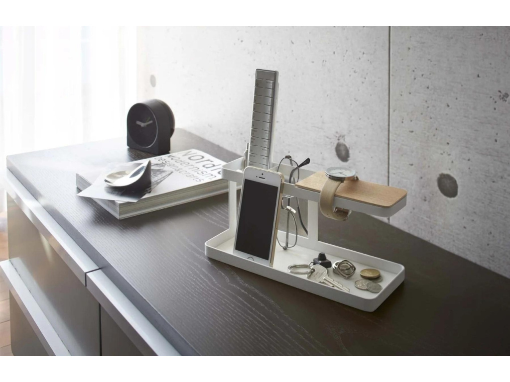 Multifunkční stojan Tower od značky Yamazaki je elegantní a praktický doplněk pro váš pracovní stůl, noční stolek nebo předsíňovou polici. Kombinace bíle lakovaného kovu a poličky z přírodní dýhy vytváří moderní a minimalistický design, který se snadno hodí do různých typů interiérů. Multifunkční stojánek je ideální pro odkládání telefonu, mincí, hodinek, brýlí a dalších drobností. Vnitřní podložka ze silikonu zajišťuje, že odkládané předměty zůstanou na svém místě a nebudou klouzat. Jeho univerzálnost z něj činí praktický doplněk pro každou domácnost.
