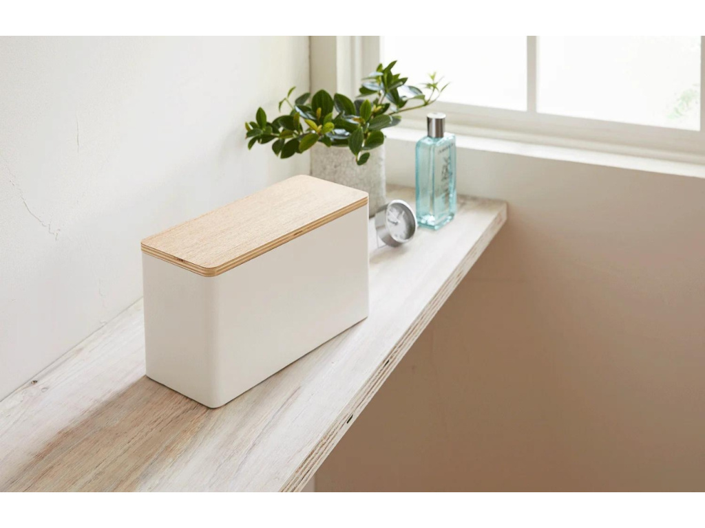 Úložný box Rin od značky Yamazaki je elegantní a funkční úložné řešení, které kombinuje moderní design s praktičností. Tento zásobník je ideální pro uskladnění drobných sanitárních potřeb, jako jsou vatové tampónky, tyčinky do uší nebo jiné malé předměty, které je třeba mít po ruce v koupelně. Kombinace bíle lakovaného kovu a víka z překližky vytváří moderní a minimalistický design, který se snadno hodí do různých typů interiérů. Uvnitř zásobníku se nachází přepážka, která umožňuje oddělené uložení různých předmětů a usnadňuje jejich organizaci. I když je zásobník primárně určen pro koupelnu, jeho elegantní design a praktické rozměry umožňují jeho použití i v jiných místnostech domácnosti, například v ložnici, na pracovním stole nebo v kuchyni.