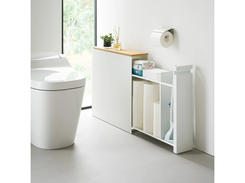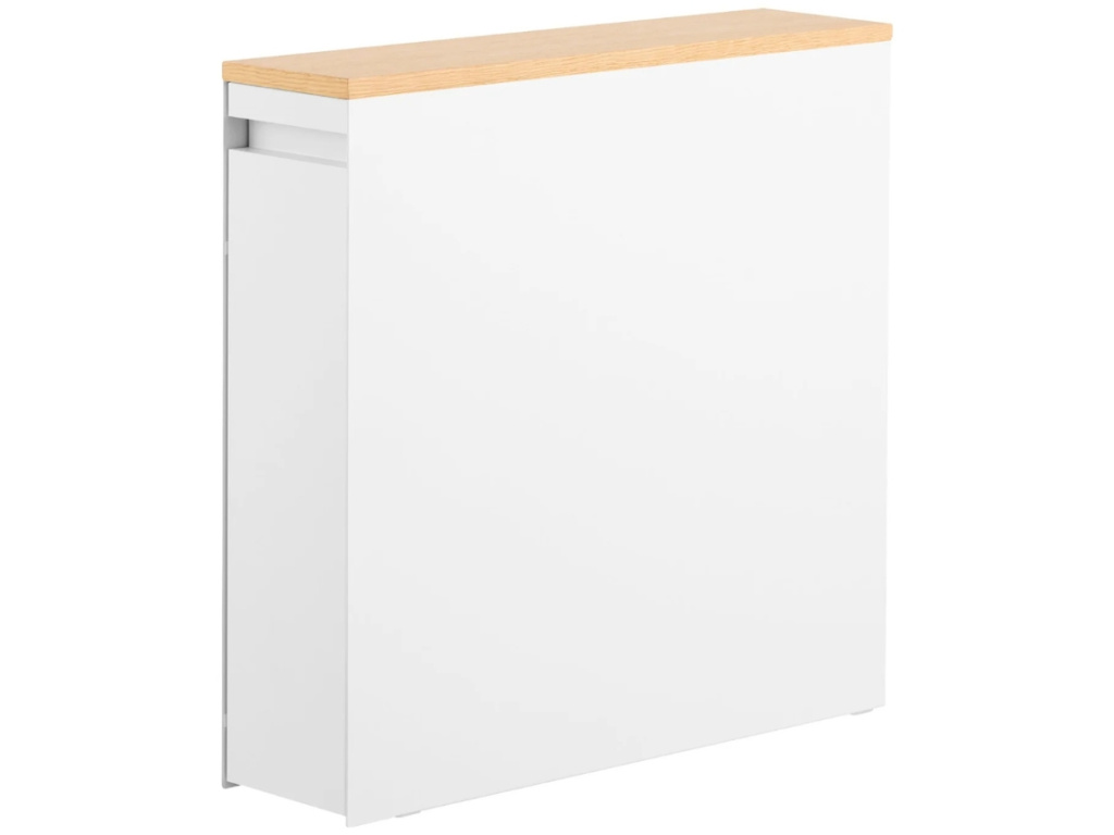 Organizér Tower od značky Yamazaki je důmyslným řešením pro každého, kdo touží po uklizené a elegantní koupelně. Tento úložný pomocník je navržen s důrazem na funkčnost, estetiku i každý detail – od čistých linií až po kvalitní materiály. Elegantní kombinace matného kovu a přírodní dýhované horní desky působí vzdušně, moderně, a přitom harmonicky zapadne do každé koupelny nebo toalety – od minimalistické po skandinávsky laděnou. Hlavním prvkem je prostorná zásuvka na kolečkách, která se lehce vysouvá a ukrývá prakticky rozdělený úložný prostor. Díky chytrému vnitřnímu členění snadno uložíte až 12 rolí toaletního papíru, WC štětku, čisticí prostředky i další nezbytnosti. Vše zůstává přehledně uspořádané, ale diskrétně skryté. Tower s lehkostí promění i ten nejmenší prostor v přehledné, stylové a funkčně uspořádané místo, kde má každý detail svůj jasně daný účel.