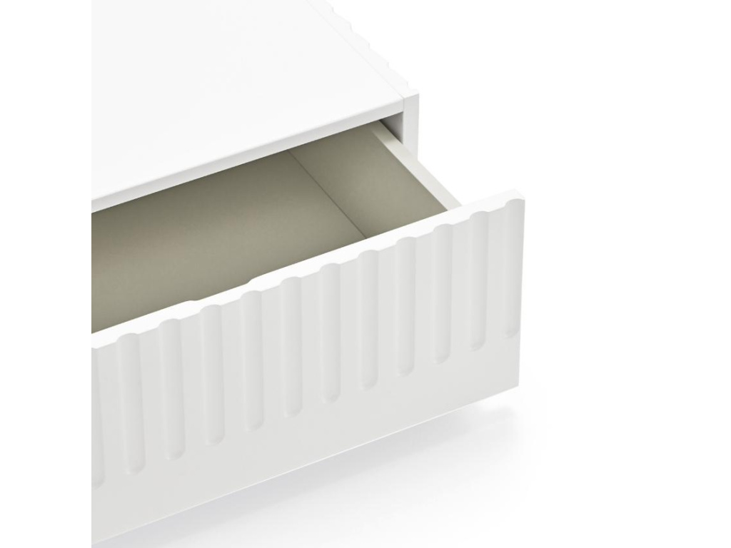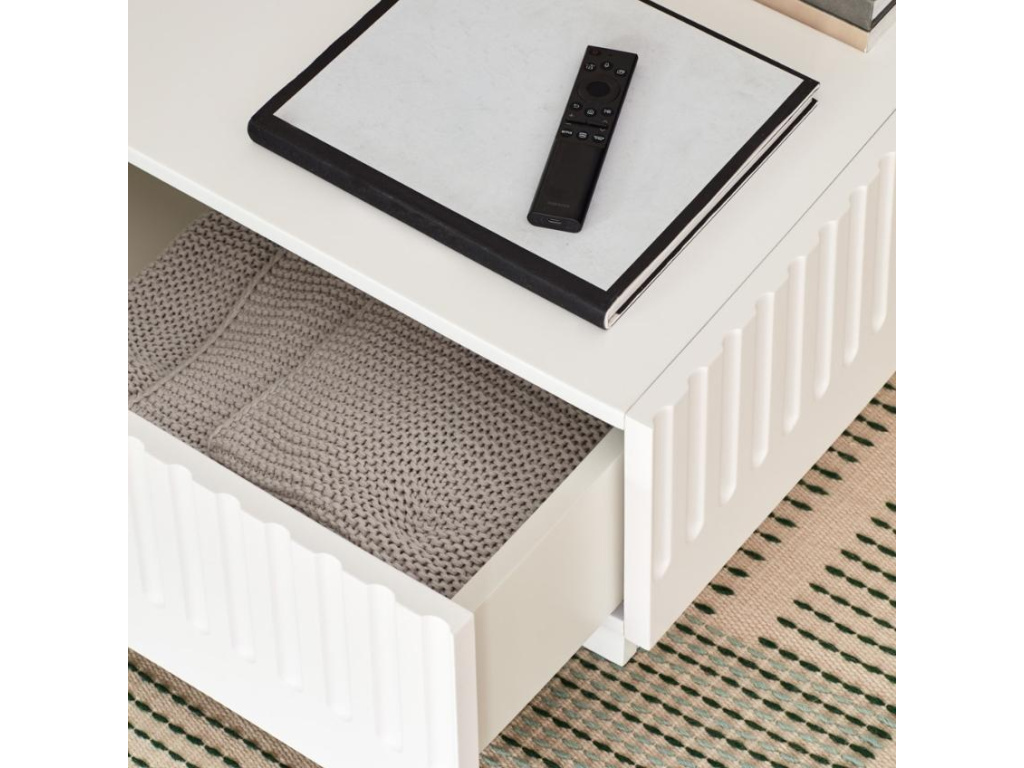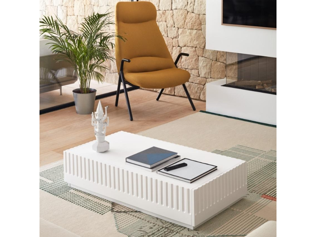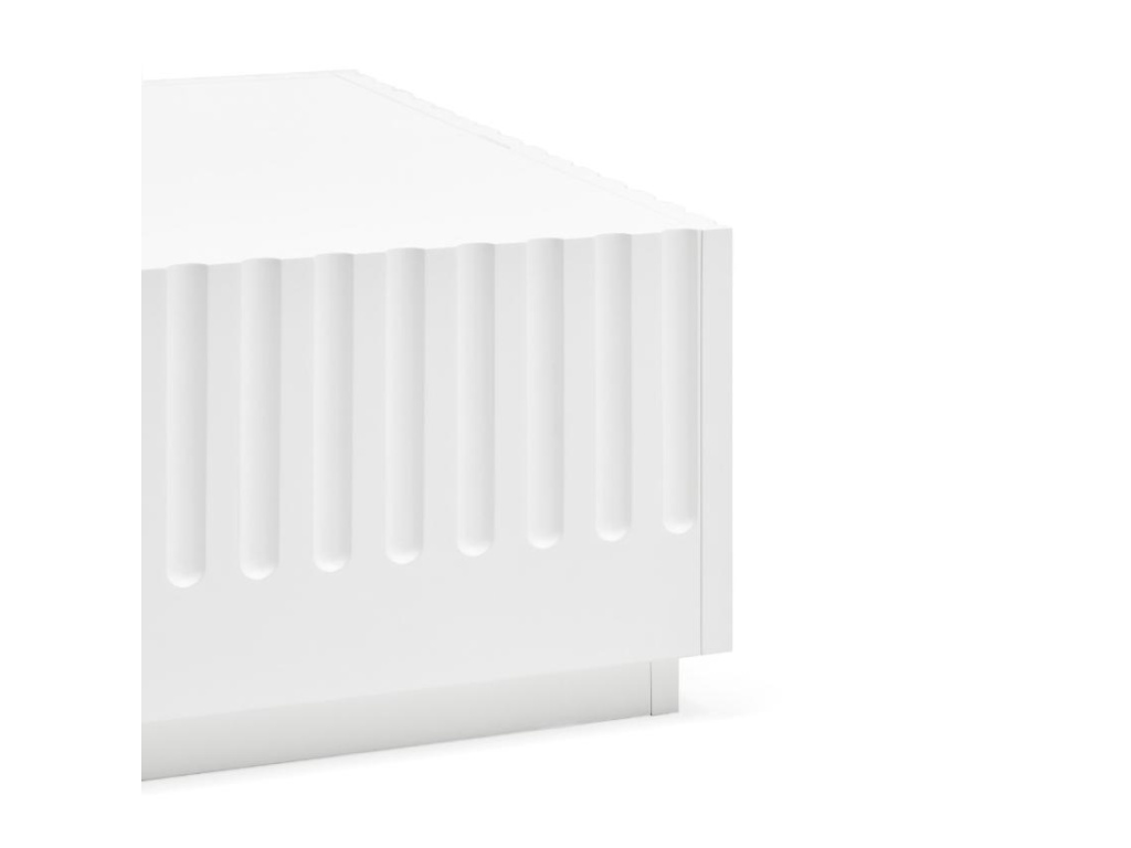 Stylový konferenční stolek Teulat Doric se díky svému nadčasovému a minimalistickému designu stane ideálním doplňkem každého moderního interiéru. Zajímavým prvkem je vzorek kolem jeho obvodu, který nábytku dodává na osobitosti a stylu. Stolek je vyroben z lakovaného MDF v elegantní bílé barvě. Disponuje praktickým úložným prostorem v podobě dvou zásuvek, díky nimž bude úklid a organizace inventáře mnohem jednodušší, než kdy dřív.