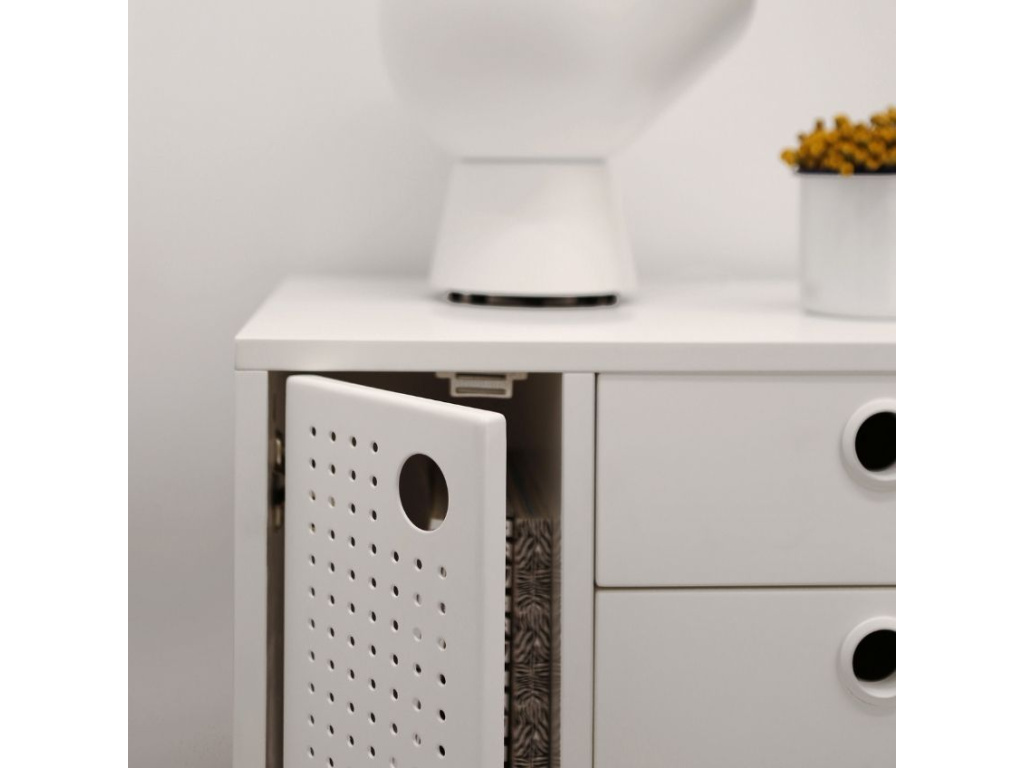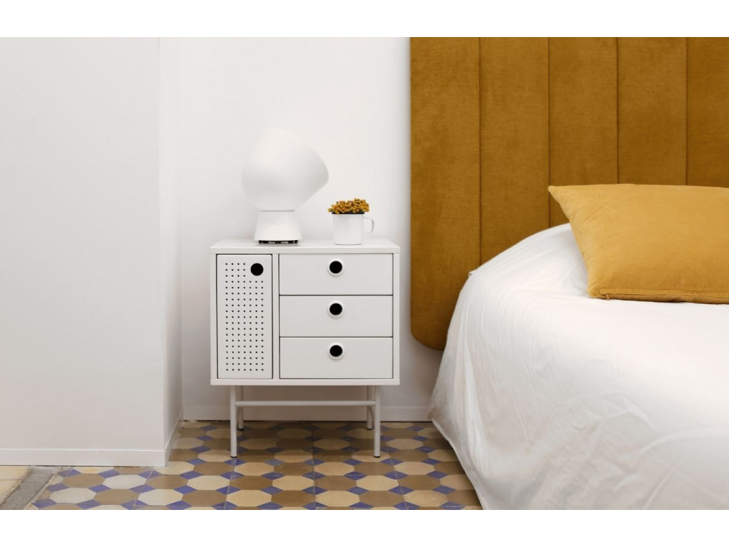 Bílý noční stolek Teulat Punto zaujme kombinací materiálů a designem s lehkým nádechem industriálního stylu, díky kterému krásně vynikne v každé moderně zařízené ložnici. Korpus stolku je z MDF se zajímavým designovým prvkem v podobě děrovaných bílých kovových dvířek a úchytů pro snadnější vysouvání zásuvek. Celek doplňuje tenká a elegantní kovová podnož v černé barvě. Praktickou výhodou stolku je netradičně velký úložný prostor jenž je rozdělen do výsuvných zásuvek a police za uzavíratelnými dvířky.