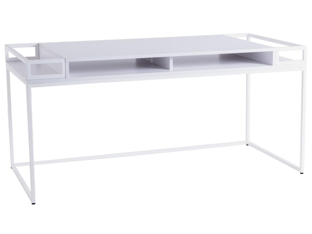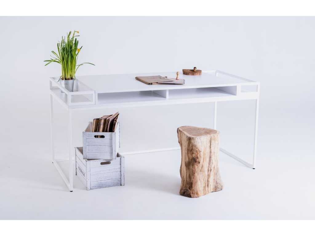 Kancelářský stůl Hugo je ideální volbou pro moderní a minimalistické kanceláře či domácí pracovny. Bíle lakovaná laminátová deska vytváří společně s kovovou podnoží atraktivní kontrast, který zaujme. Příjemným bonusem je úložný prostor ve formě 2 otevřených zásuvek a 2 bočních polic, kam pohodlně uložíte veškerý váš inventář. Pracovní stůl Hugo se skvěle hodí do moderních interiérů.