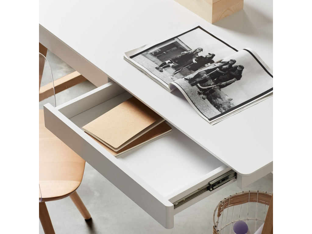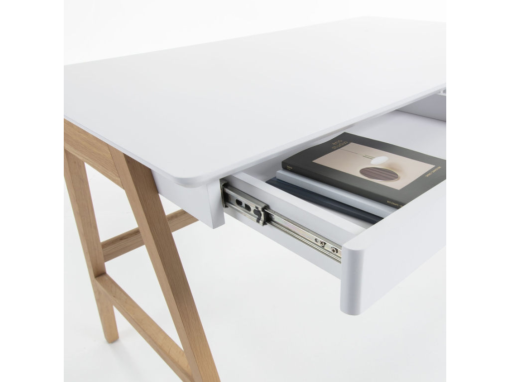 Pracovní stůl Kave Home Dyana v nestárnoucím barevném spojení bílé lakované MDF desky a podnože z dubového přírodně zbarveného dřeva vnese do každého interiéru vánek skandinávského designu. Stůl nabízí úložný prostor v podobě dvou zásuvek, které pojmou nejrůznější drobnosti a psací potřeby. Díky své ideální velikosti představuje skvělou volbu pro menší interiéry, do kterých dodá potřebnou pracovní plochu a také moderní styl.