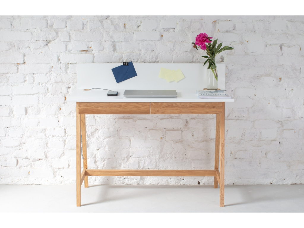 Hledáte-li minimalistický a zároveň funkční a elegantní stůl do vaší pracovny, je RAGABA LUKA právě pro vás. Stůl disponuje dvěma zásuvkami z jasanového masivu, které vám poskytnou praktické úložiště na potřebné věci. Pracovní deska je vybavena kulatým otvorem na kabely a odnímatelným zadním panelem, který poskytne plochu například pro lepící papírky či fotografie. Odpočinek pro unavené nohy nabídne příčná lišta, která je součástí podnože. LUKA bude perfektním designovým kouskem do vaší pracovny, využití najde také v dětském nebo studentském pokoji.