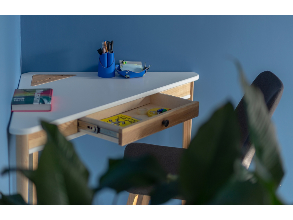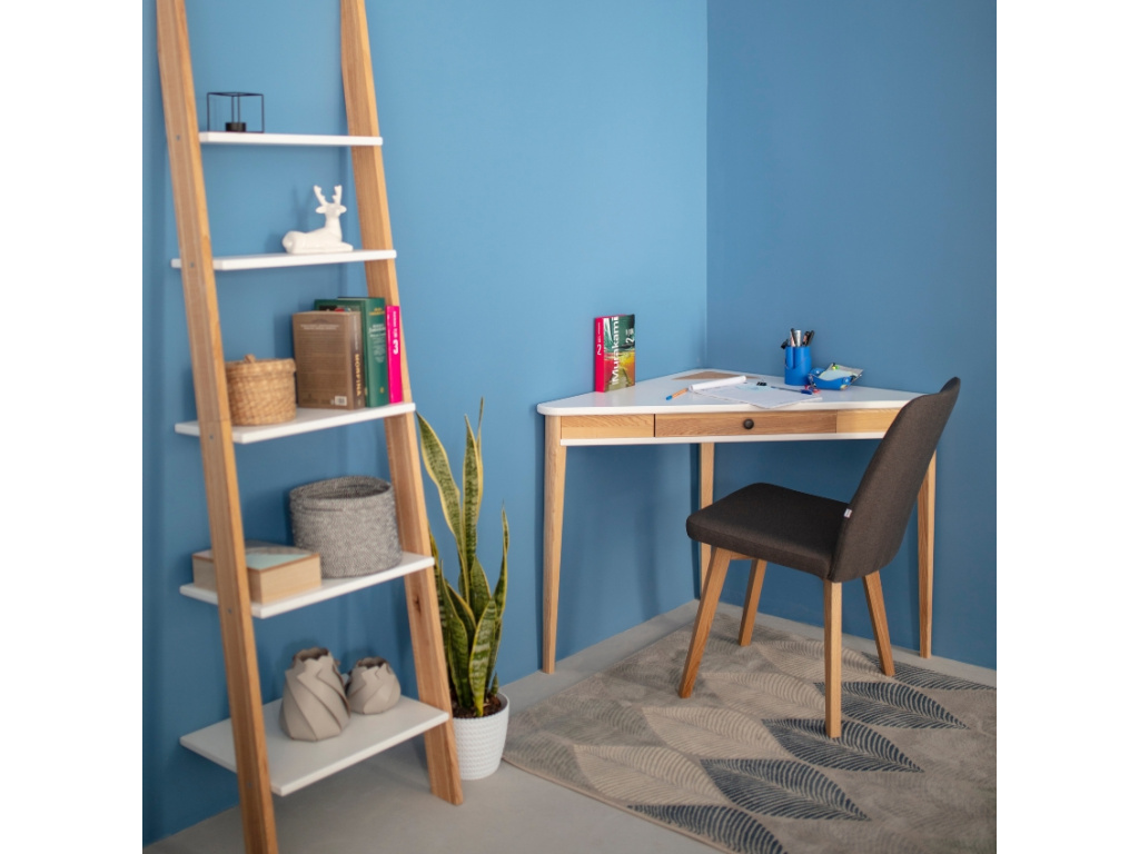 Pracovní stůl RAGABA ASHME je tady pro všechny, kteří kladou důraz na funkčnost a minimalistický design. Deska stolu je vyrobena z lakovaného MDF a doplňuje ji dřevěný organizér na vývod kabelů. Elegantní podnož tvoří tři dlouhé nohy, které jsou vyrobeny z jasanového dřeva. Na stůl se vám hravě vejde například notebook a kancelářské potřeby. Praktická zásuvka je opatřena tlumičem, který zajistí hladké otevírání a zavírání a nebude tak docházet k rychlému opotřebení. Díky svému tvaru a velikosti bude ASHME ideálním kouskem do menších interiérů či garsonky. Zároveň se stane perfektním designovým kouskem do vaší pracovny. Využití najde také v dětském nebo studentském pokoji.
