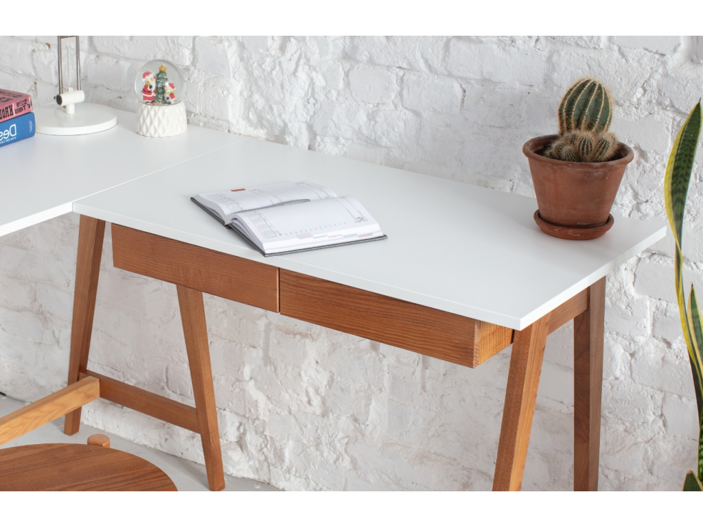 Hledáte-li do vaší pracovny rohový stůl ve skandinávském designu, je RAGABA LUKA právě pro vás. Stůl disponuje dvěma zásuvkami z jasanového masivu, které vám poskytnou praktické úložiště na potřebné věci. Díky rohové desce z MDF vám stůl nabídne pohodlí a dostatečný prostor při práci. Uspořádání věcí a kancelářských potřeb tak bude o mnoho snazší. Elegantní minimalistická podnož je vyrobena z jasanového dřeva, namořena mořidlem v odstínech dubu. LUKA bude perfektním designovým kouskem do vaší pracovny, využití najde také v dětském nebo studentském pokoji.