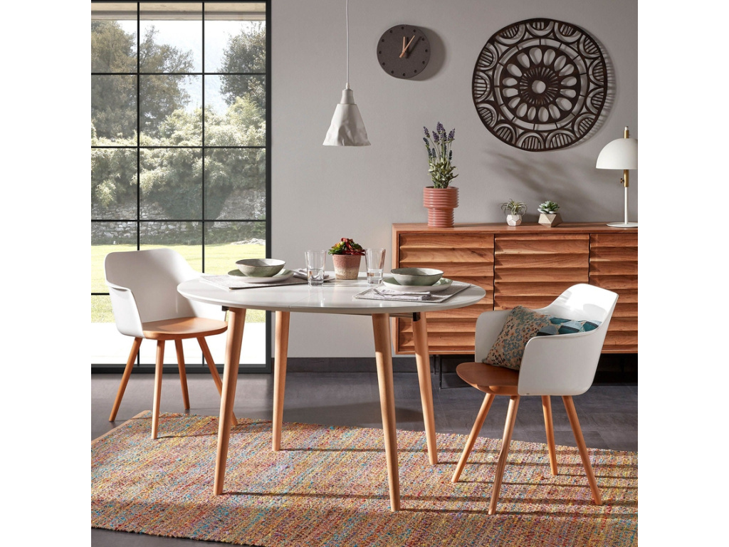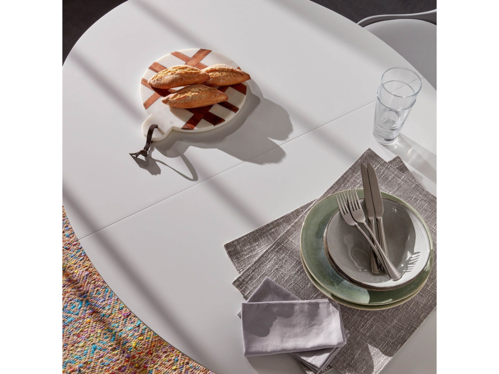 Elegantní jídelní stůl Kave Home Oqui si zamiluje každý, kdo rád efektivně a stylově šetří místo. Po rozložení stolu se ke stolování může přidat až 10 osob. Deska je vyrobená z matně lakované MDF desky a spolu s podnoží z bukového dřeva působí moderním a svěžím designem. Hodí se do menších bytů i prostorných jídelen v nádechu skandinávského stylu.