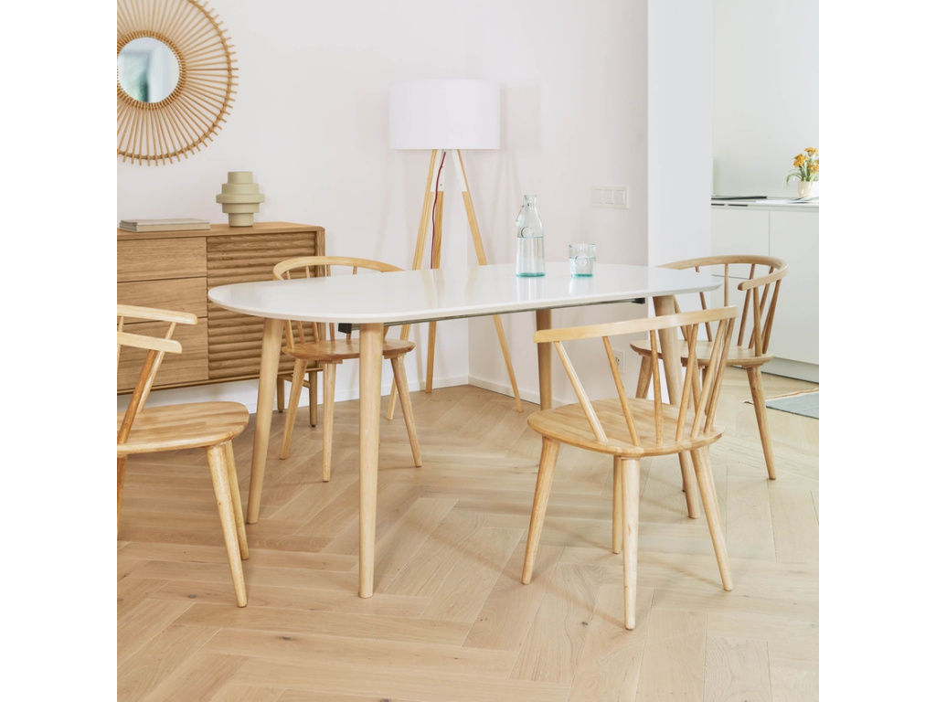 Elegantní jídelní stůl Kave Home Oqui si zamiluje každý, kdo rád efektivně a stylově šetří místo. Po rozložení stolu se ke stolování může přidat až 10 osob. Deska je vyrobená z matně lakované MDF desky a spolu s podnoží z bukového dřeva působí moderním a svěžím designem. Hodí se do menších bytů i prostorných jídelen v nádechu skandinávského stylu.