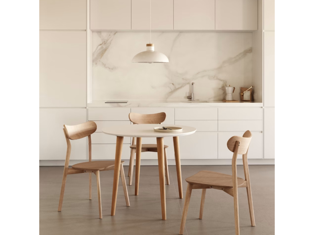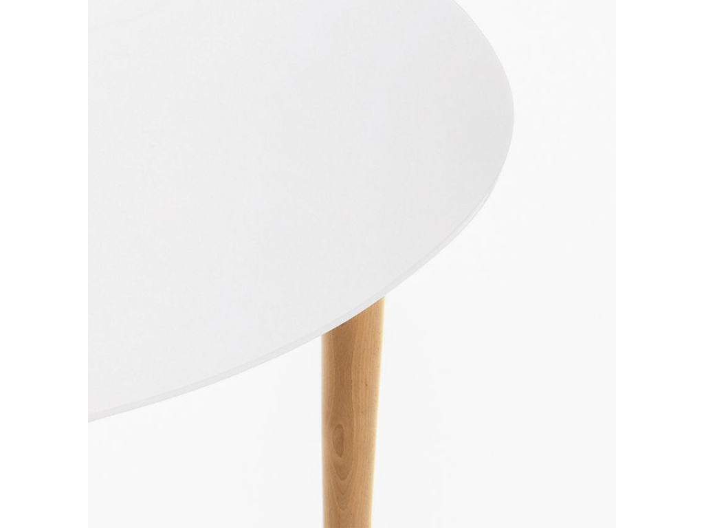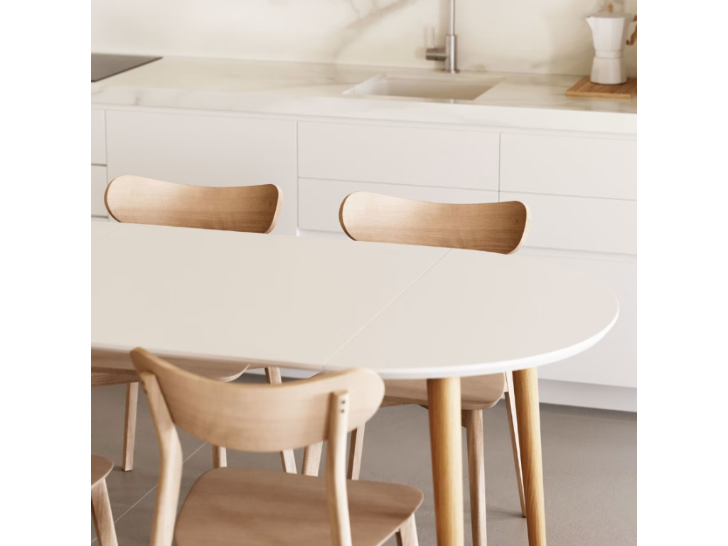 Elegantní jídelní stůl Kave Home Oqui si zamiluje každý, kdo rád efektivně a stylově šetří místo. Stůl je kulatý a po rozložení do oválného tvaru se ke stolování může přidat až 6 osob. Deska je vyrobená z matně lakované MDF desky a spolu s podnoží z bukového dřeva působí moderním a svěžím designem. Hodí se do menších bytů i prostorných jídelen v nádechu skandinávského stylu.