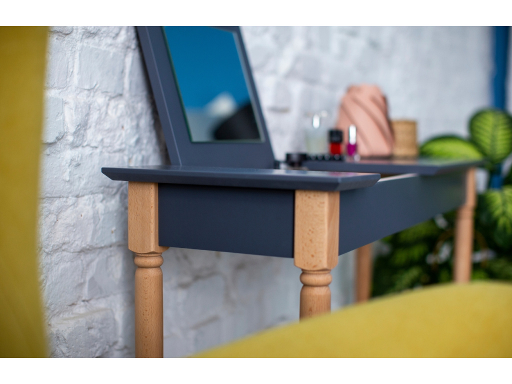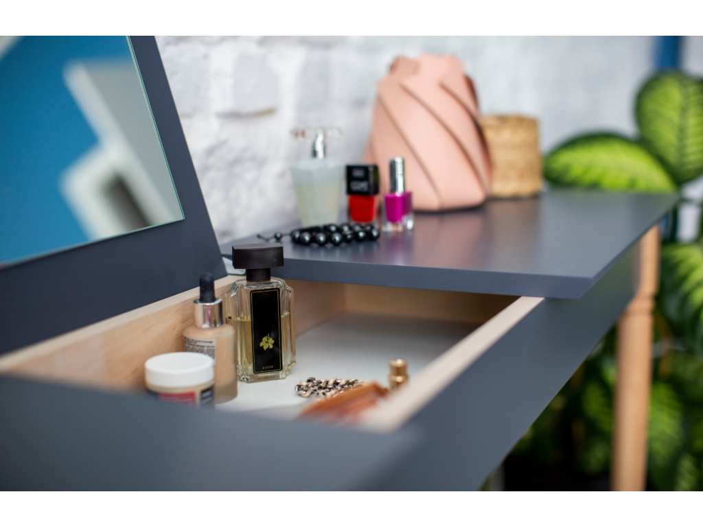 Toaletní stolek RAGABA MAMO je moderním stolkem, který je inspirovaný klasickým skandinávským designem. Stolek snoubí minimalismus v podobě čisté desky z MDF a laminátu spolu s elegancí ve formě podnože, vyrobené z bukového masivu. Praktickým prvkem na desce je výklopné zrcadlo, pod kterým se skrývá úložný prostor na různé šperky či kosmetiku. Díky své úsporné velikosti se toaletní stolek hodí i do menších interiérů a skvěle vynikne například v ložnici, obývacím pokoji či předsíni.