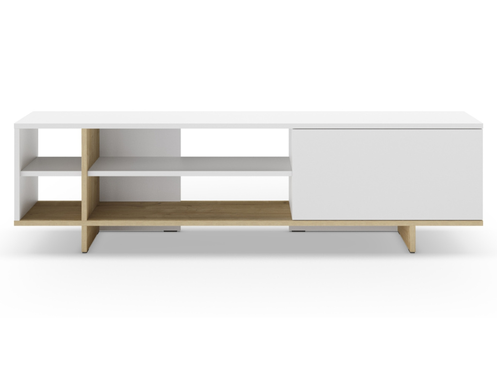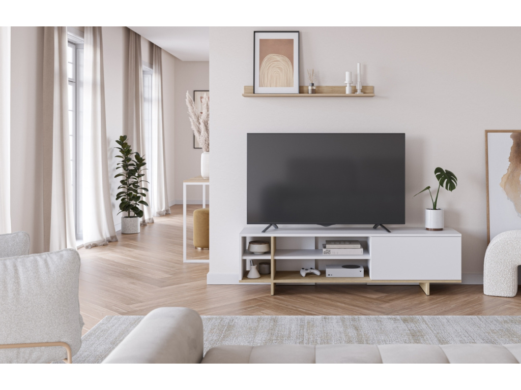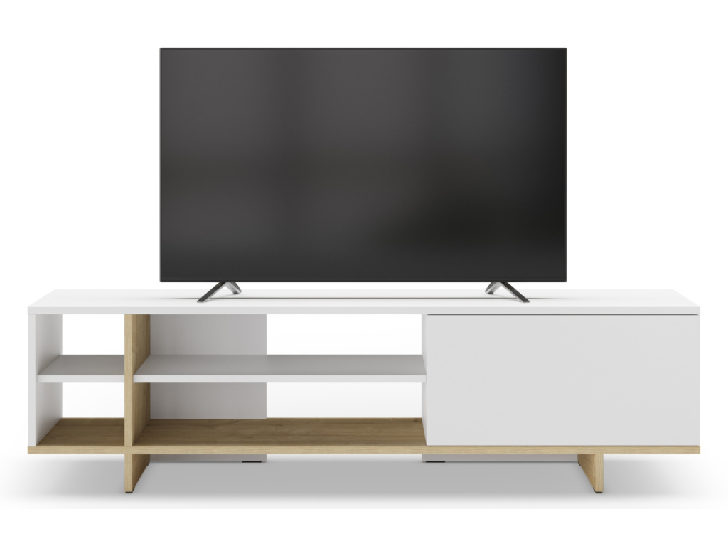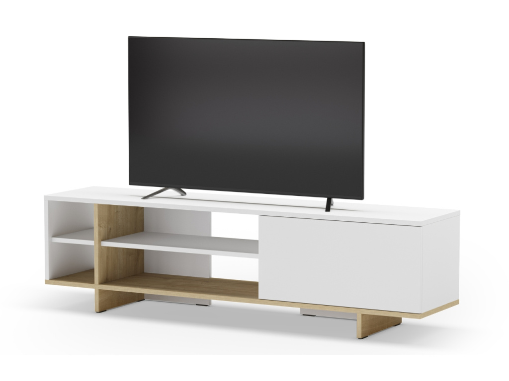 TV stolek Cequoia v kombinaci bílého laminátu a dubového dekoru zaujme čistými liniemi a vzdušným dojmem. Otevřené police nabízejí praktický prostor pro elektroniku i dekorace, zatímco výklopná skříňka se skrytým otvorem na kabely zajistí elegantní řešení bez rušivých detailů. Díky stabilní konstrukci a odolným materiálům vydrží každodenní používání. K dispozici je ve dvou rozměrech a dvou barevných variantách.