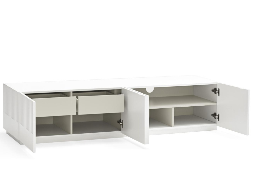 Stylový TV stolek Teulat Doric se díky svému nadčasovému a minimalistickému designu stane ideálním doplňkem každého moderního interiéru. Zajímavým prvkem je vzorek na předních dvířkách a po stranách, který nábytku dodává na osobitosti a stylu. Stolek je vyroben z lakovaného MDF v elegantní bílé barvě. Disponuje praktickým úložným prostorem ve formě pěti uzavřených polic a dvou zásuvek.
