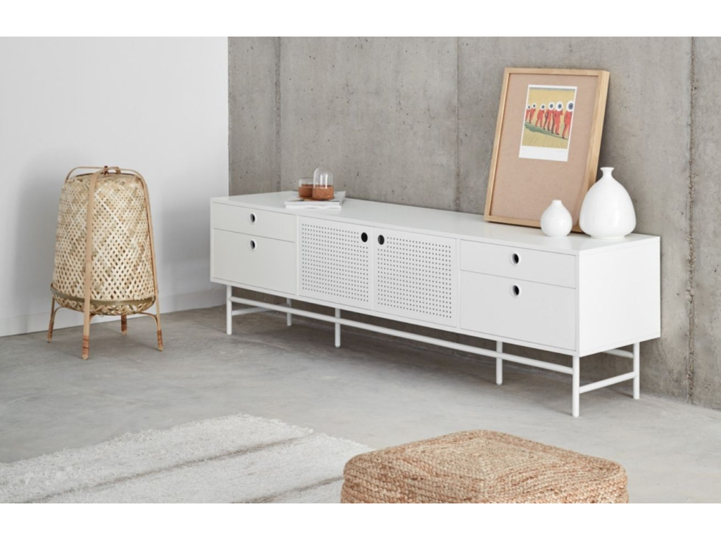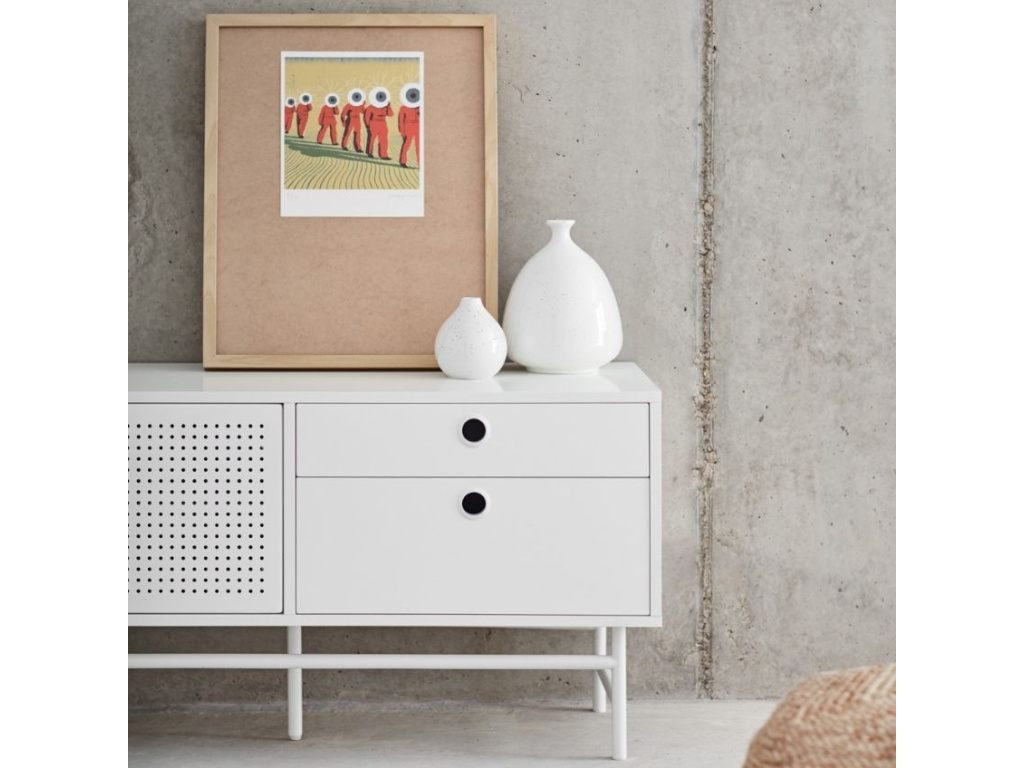 Bílý TV stolek Teulat Punto zaujme kombinací materiálů a designem s lehkým nádechem industriálního stylu, díky kterému krásně vynikne v každém moderně zařízeném interiéru. Korpus stolku je z MDF se zajímavým designovým prvkem v podobě děrovaných bílých kovových dvířek a úchytů pro snadnější vysouvání zásuvek. Celek doplňuje tenká a elegantní kovová podnož v barvě stolku. Úložný prostor je prakticky rozdělen do výsuvných zásuvek a polic za uzavíratelnými dvířky, což napomáhá k snadnější organizaci a rychlejšímu úklidu.