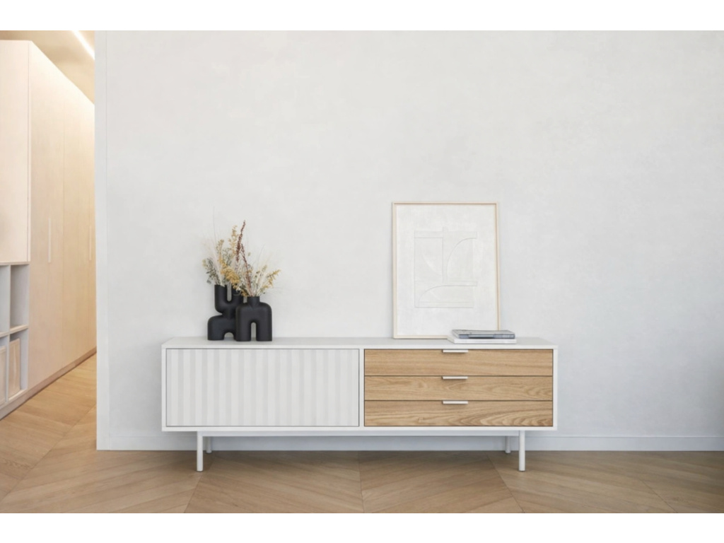 Stylový TV stolek Teulat Sierra zaujme na první pohled svým minimalistickým designem a harmonikovým vystouplým vzorem na předních dvířkách. Komoda je vyrobena z lakovaného MDF v elegantní bílé barvě, která krásně kontrastuje s přední stranou zásuvek z dubové dýhy. Celý korpus doplňuje tenká kovová podnož. Stolek disponuje praktickým úložným prostorem ve formě uzavřených polic a tří zásuvek. Teulat Sierra vynikne zejména v moderně laděných interiérech.