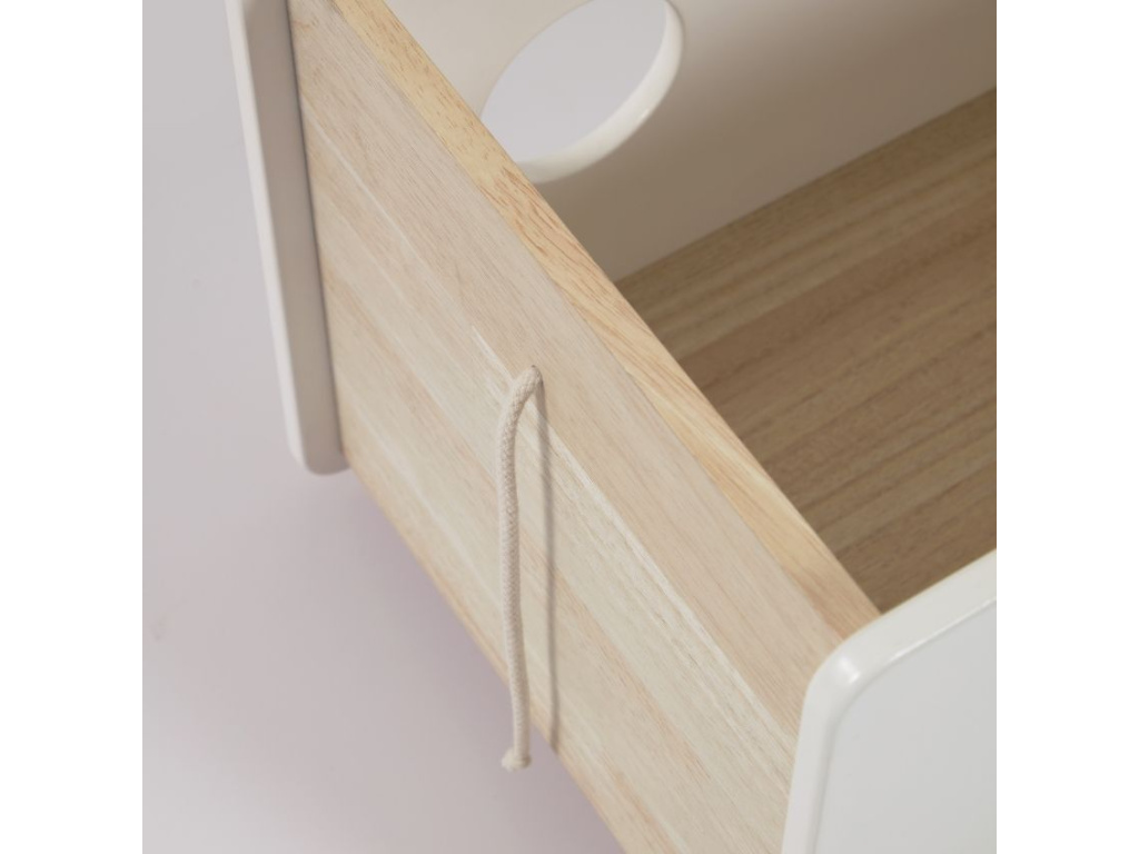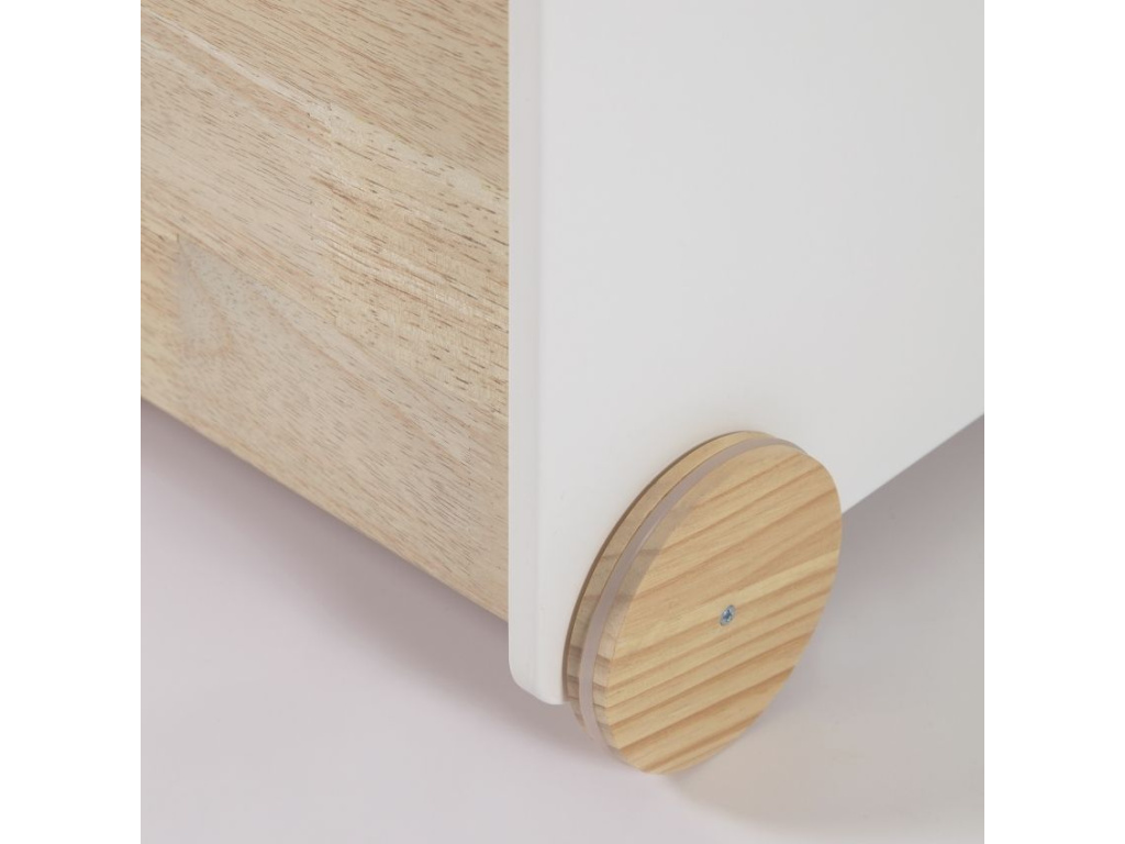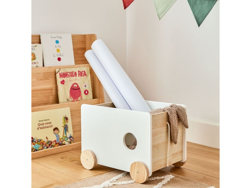 Bianina značky Kave Home je dětská hračka, která je vyrobena z masivního borovicového dřeva přírodní barvy a bíle lakovaných MDF desek. Použité dřevo získalo certifikát FSC, takže jeho výroba byla šetrná k životnímu prostředí. Na boční straně vozíku najdete provázek, díky kterému ho mohou za sebou děti tahat a převážet v něm své hračky a knížky po pokoji. A pokud si s vozíkem zrovna nebude nikdo hrát, skvěle poslouží jako úložný box.